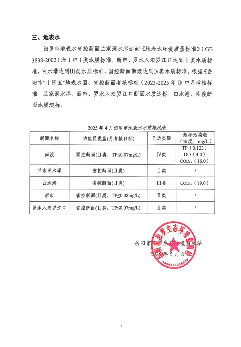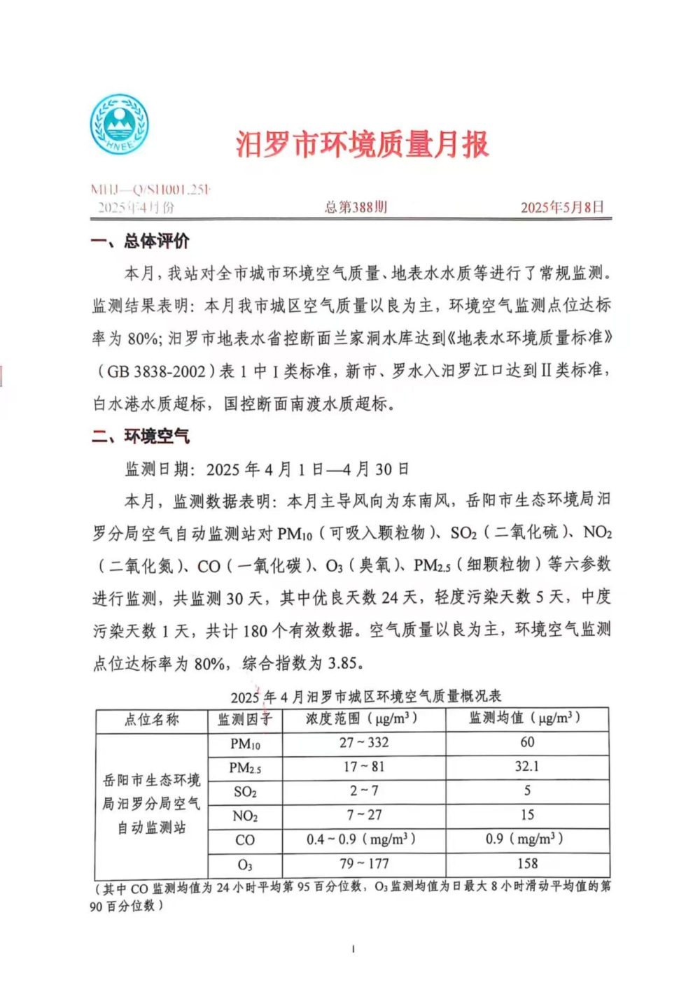 汨罗市环境质量月报(2025年4月份)