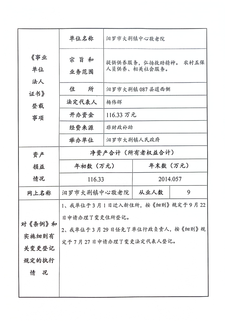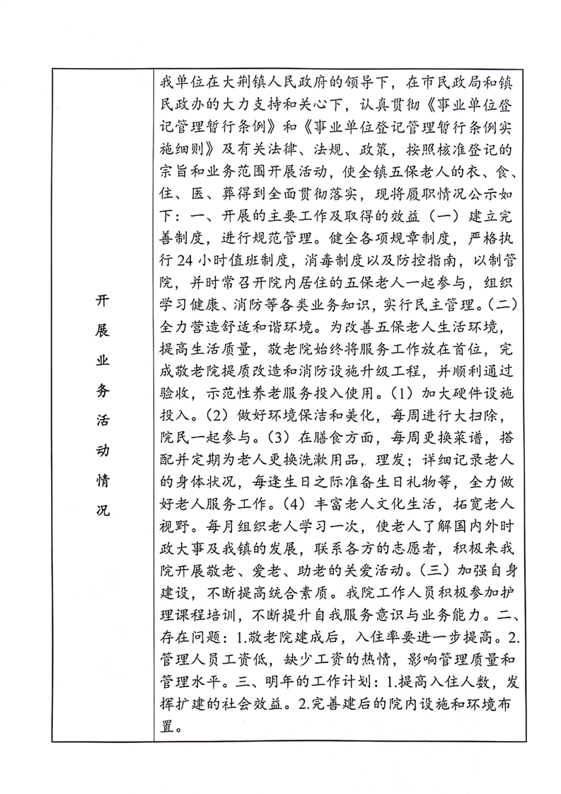 汨罗市大荆镇中心敬老院2023年度事业单位法人年度报告书