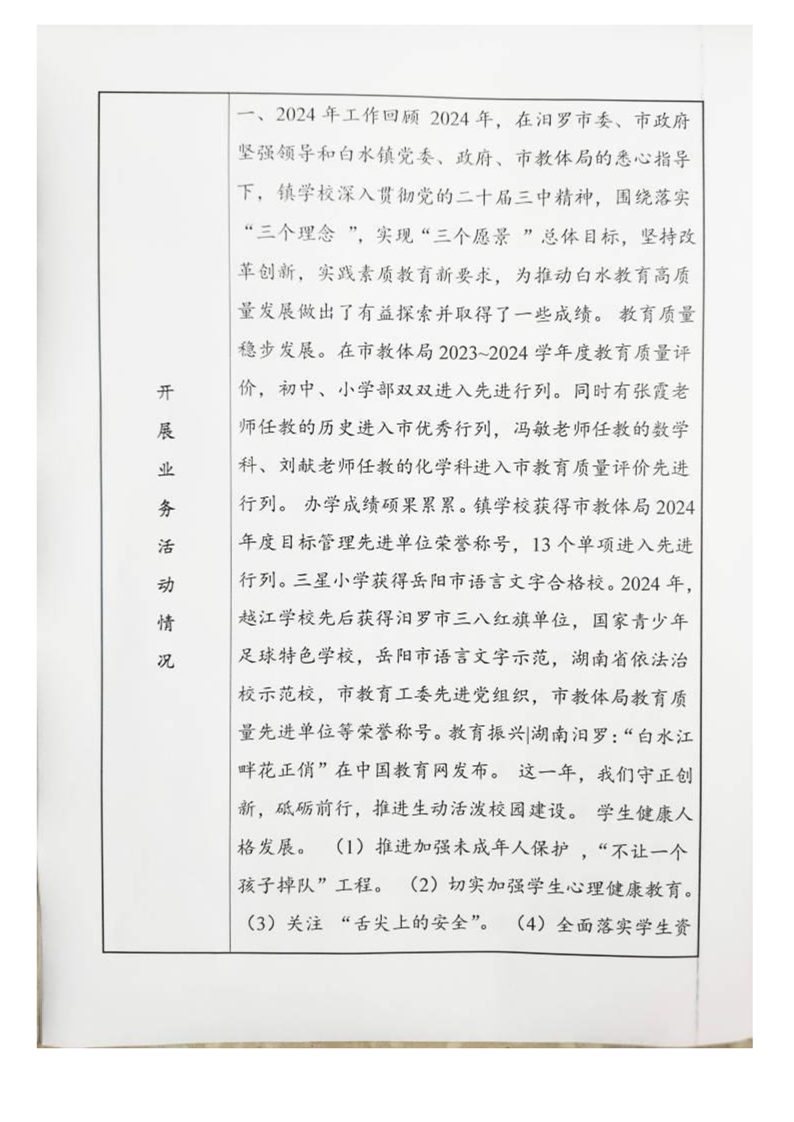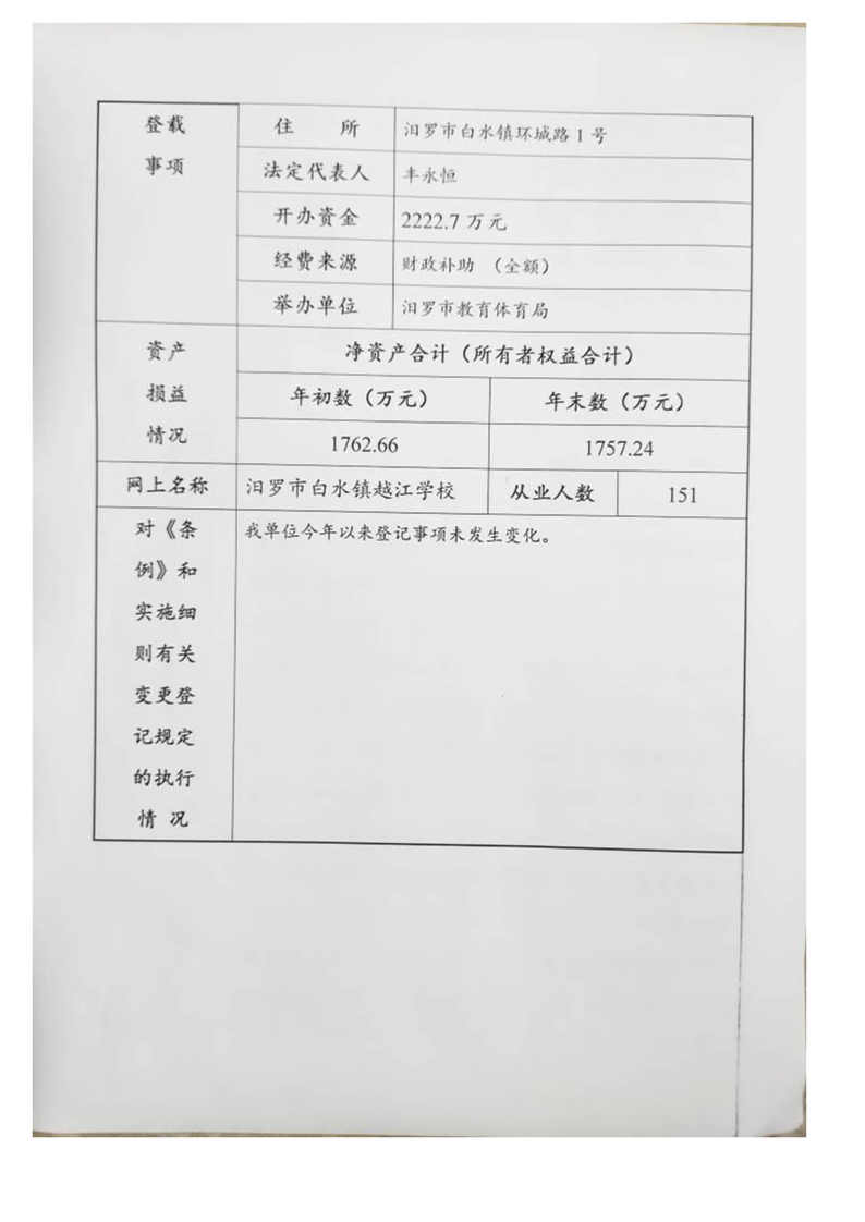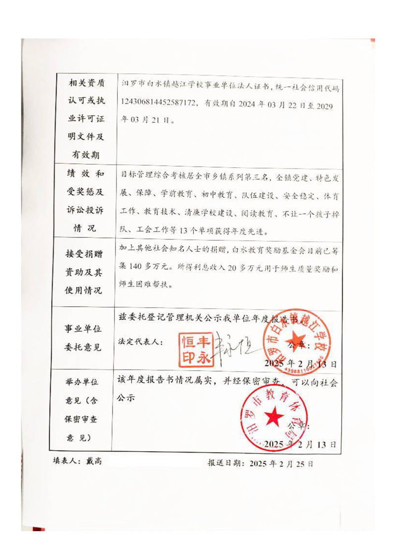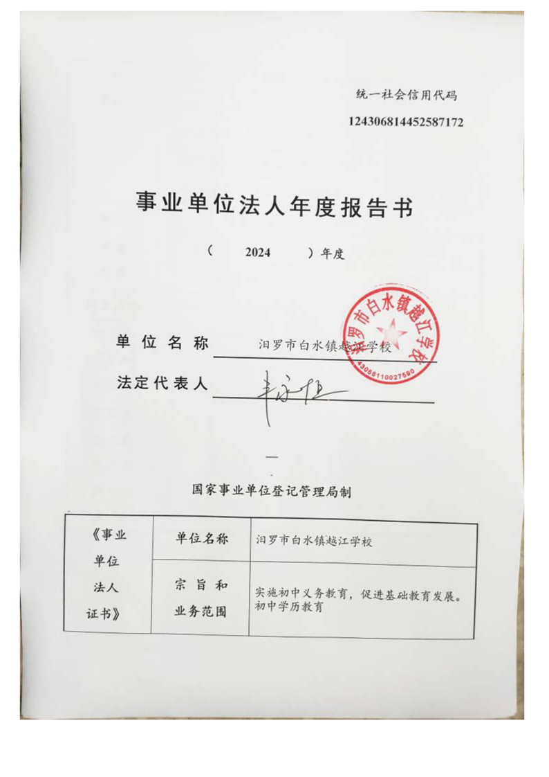 2024年汨罗市白水镇越江学校法人年度报告书