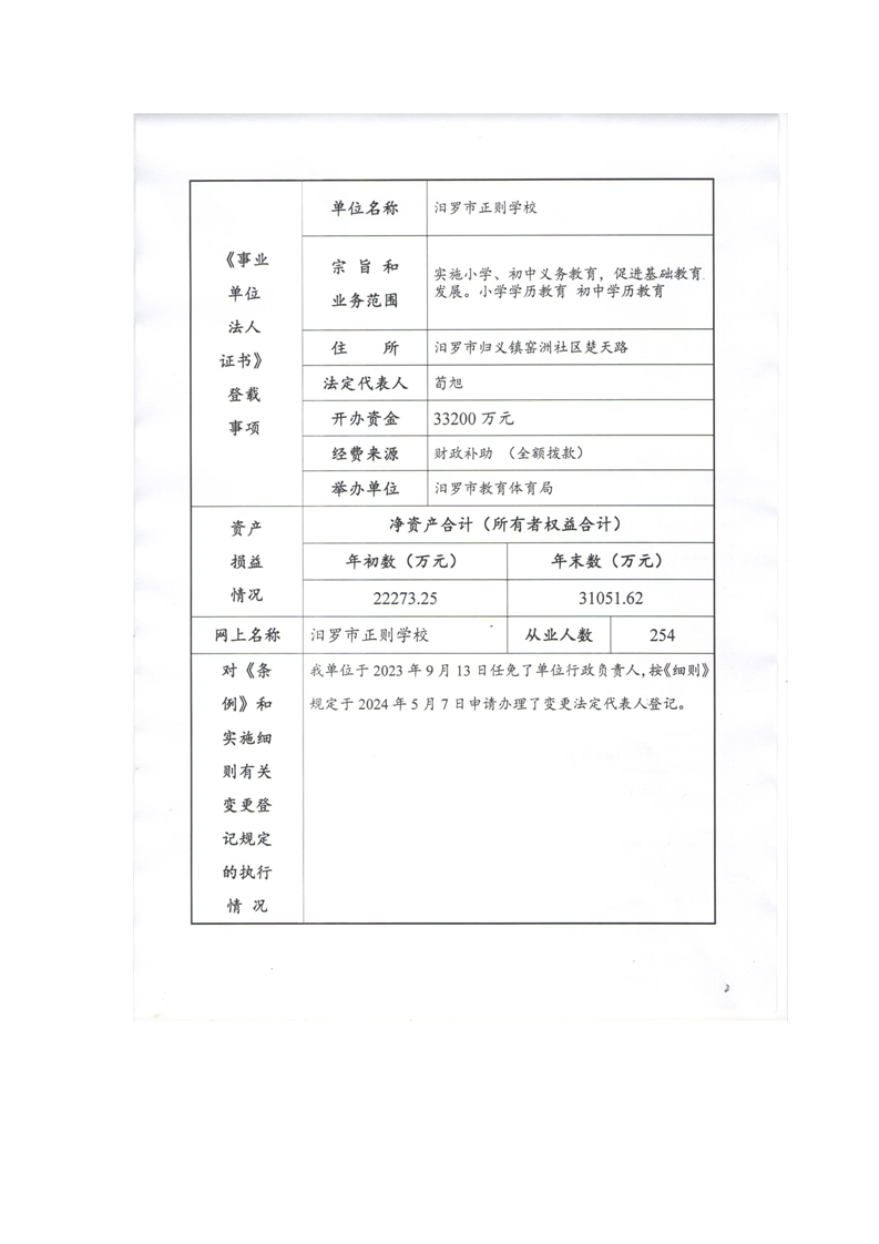 2024年汨罗市正则学校法人年度报告书