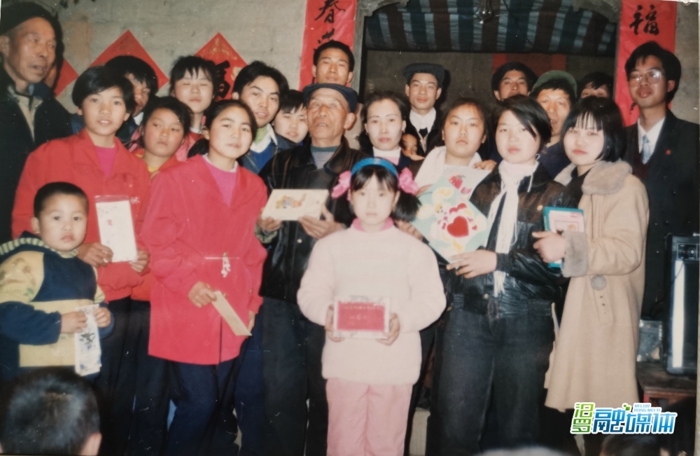 1995年2月,江立云在家乡组织开展“九五之春”文艺晚会。图为活动后参会人员合影留念。