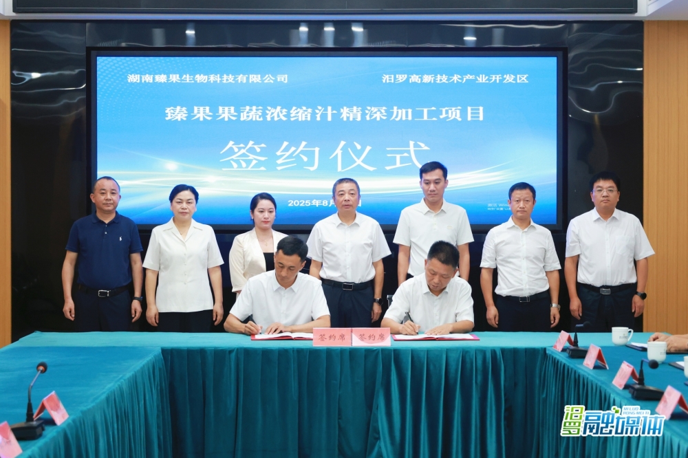 汨罗融媒体讯(记者 夏凡)8月27日,臻果果蔬浓缩汁精深加工项目签约仪式在汨罗高新区举行,标志着汨罗推动农业产业转型升级又迈出坚实一步。市委书记朱平波主持,市委副书记、市长林恒求,市级领导王敏求、何厚德、冯勇刚 、刘勇、吴艳平 、向恩泽 、李尚兵,湖南臻果生物科技有限公司副总经理郑平跃、符兴存、王秀升,汨罗市相关部门主要负责人参加。