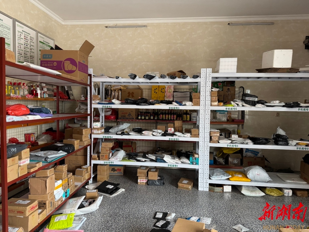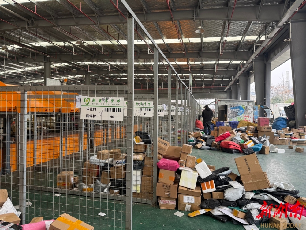 2月28日,岳阳市汨罗市屈子祠镇双楚村客货邮服务站内村民待取的包裹。湖南日报全媒体记者 于淼摄