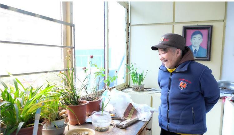 李超然老人在观察家中的花草,墙上的照片是他的古稀之年留影