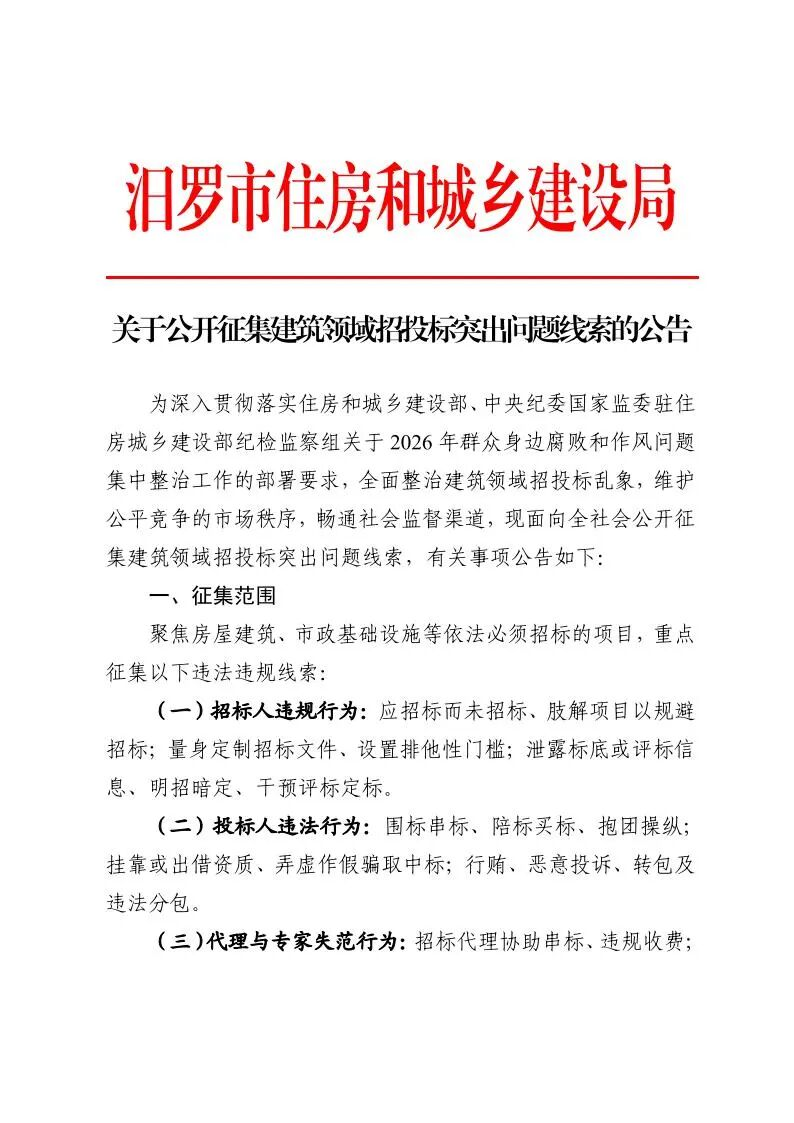 关于公开征集建筑领域招投标突出问题线索的公告