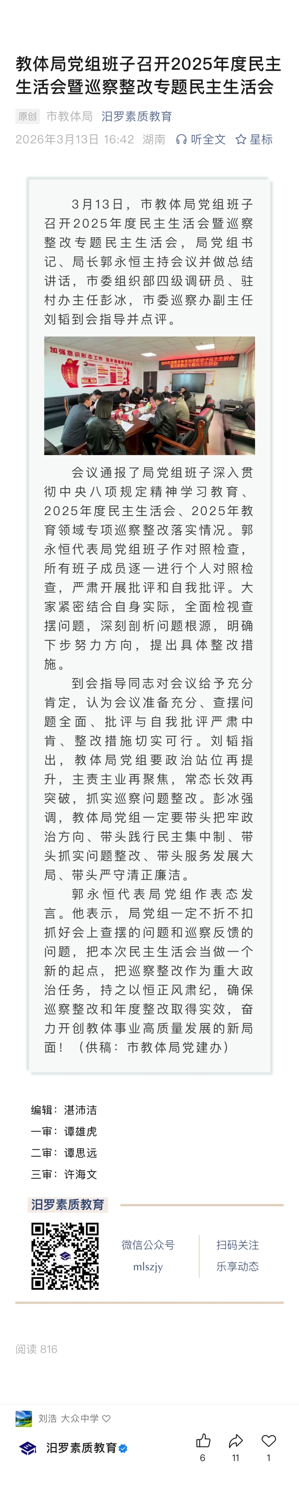 教体局党组班子召开2025年度民主生活会暨巡察整改专题民主生活会
