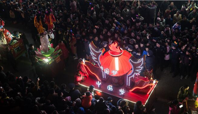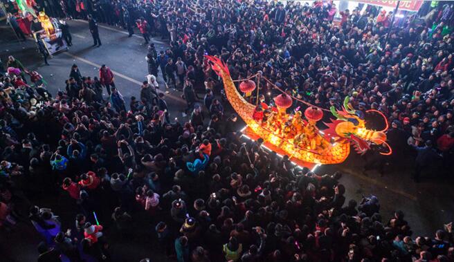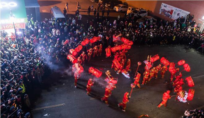 夜幕降临,三条火龙被五彩缤纷的灯展簇拥而出,烟雾从龙口中喷出,时而盘成花状,时而以头含尾,犹如神龙在云雾中翻腾。火花从神龙口中喷出,百余台故事延绵而来,伴随着欢呼涌动的人潮,元宵灯会将长乐街装扮得美仑美奂,故事古镇沸腾了起来……