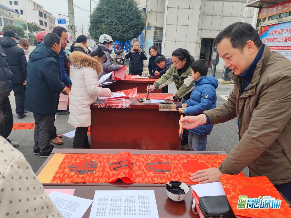 上午9时,活动现场已是人头攒动、热闹非凡。村民们早已围在桌前精心挑选着心仪的联句。来自长沙市花鸟画家协会的书法家们凝神运腕、笔走龙蛇,一幅幅寓意吉祥的联句和一个个喜庆的“福”字跃然纸上,既有传统韵味,又充满时代气息。“这手写的春联可比买的印刷的有味道多了,这样才有年味儿嘛!”捧着还散发着墨香的春联,几位老人连连赞叹。