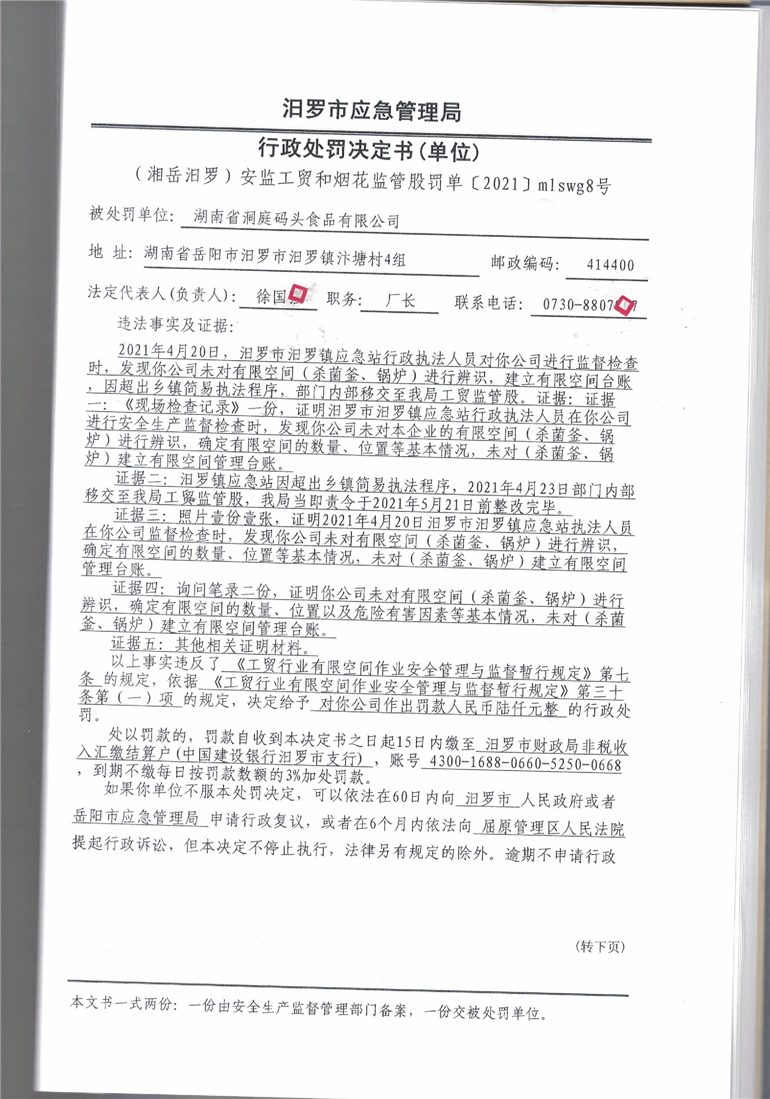 湖南省洞庭码头食品有限公司行政处罚决定书