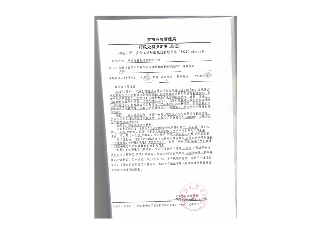湖南海鑫新材料有限公司行政处罚决定书
