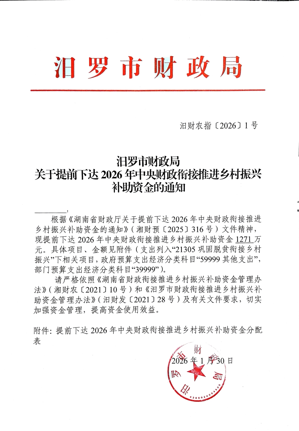 关于提前下达2026年中央财政衔接推进乡村振兴补助资金的通知