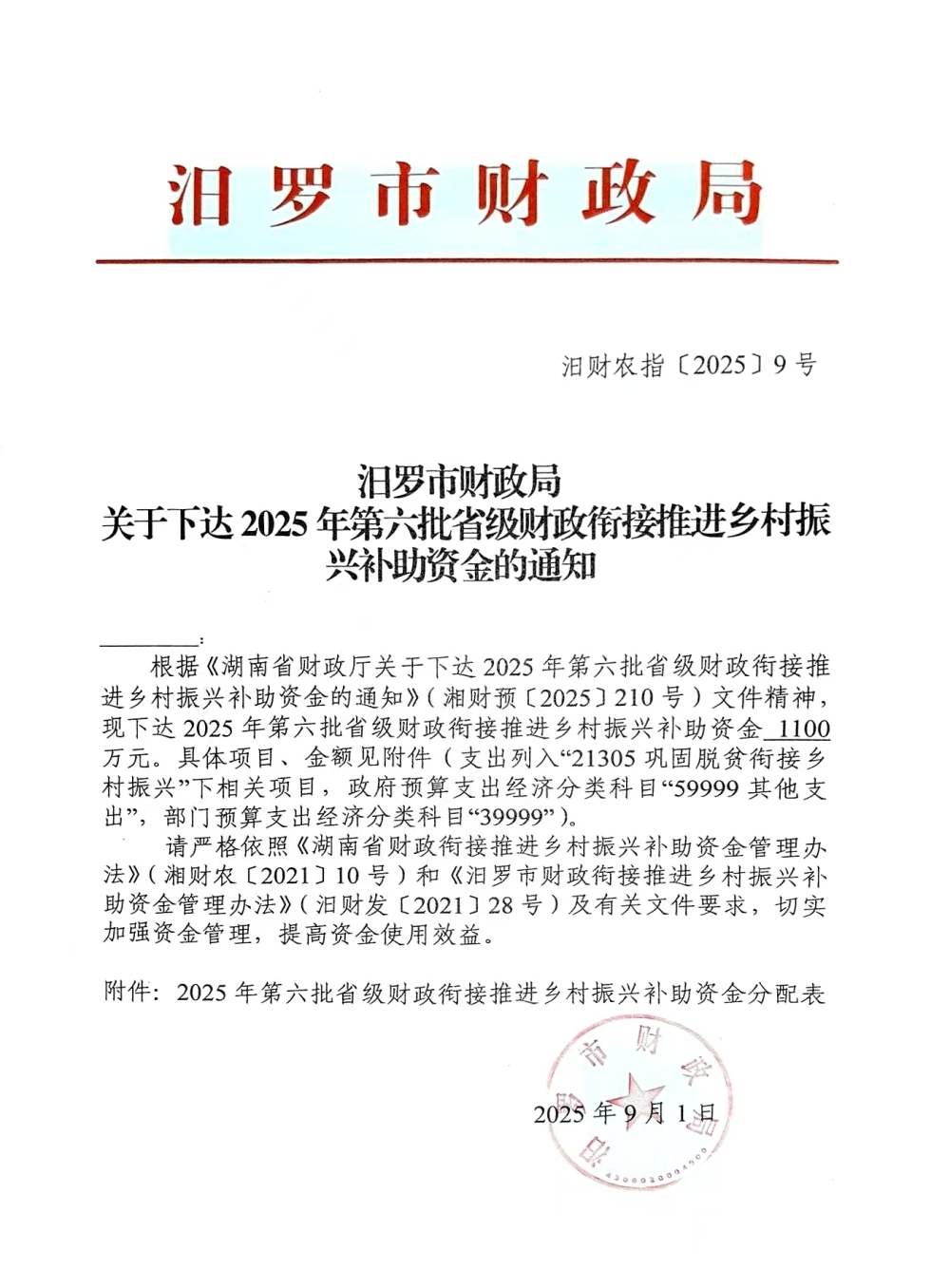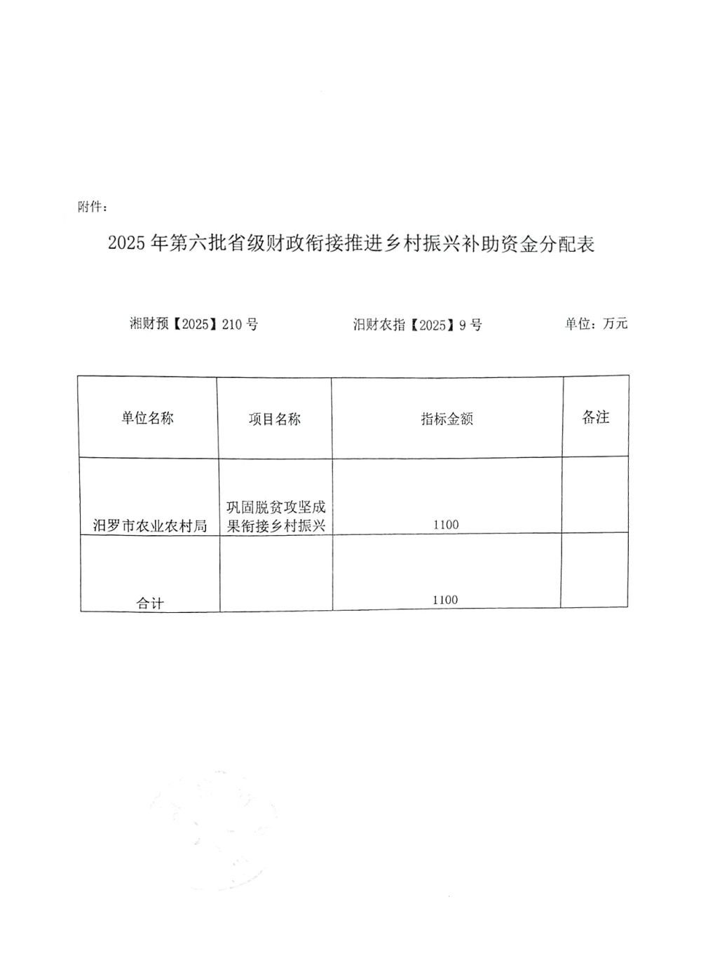 关于下达2025年第六批省级财政衔接推进乡村振兴补助资金的通知