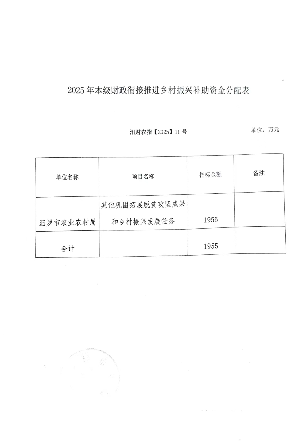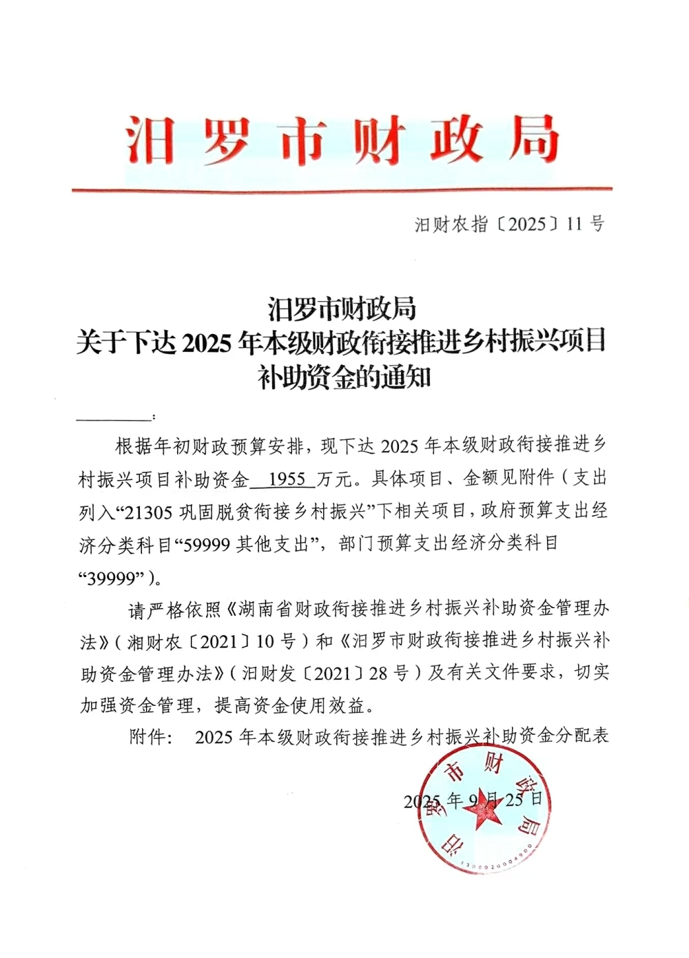 关于下达2025年本级财政衔接推进乡村振兴项目补助资金的通知