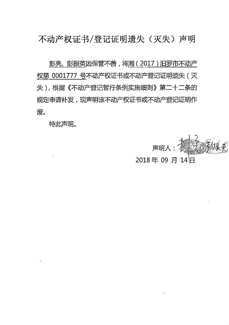 不动产权证书遗失声明(彭亮)