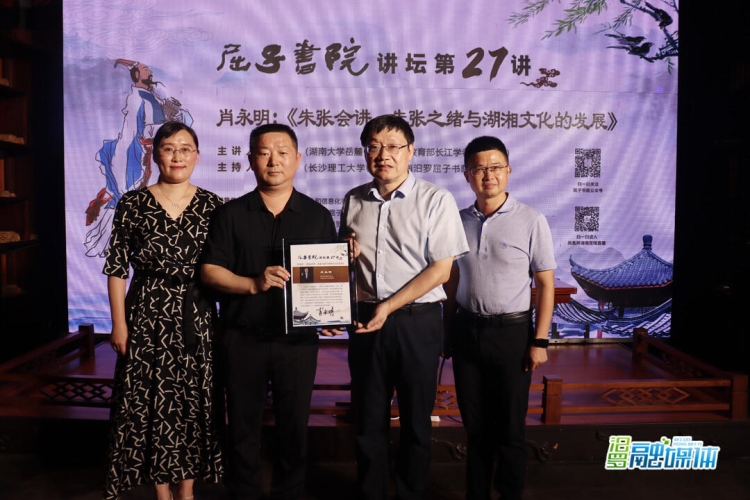 汨罗融媒体讯(记者 彭晓)9月18日下午,屈子书院讲坛第27期在汨罗屈子书院沅湘堂开讲。湖南大学岳麓书院院长、教育部长江学者特聘教授肖永明为线下100多名观众,及线上50余万网友们讲述了《朱张会讲、朱张之绪和湖湘文化的发展》,探寻湖湘文化源流,追慕朱张二贤风采。汨罗市委常委、宣传部长艾志军出席讲座。讲座由凤凰网湖南频道全程直播,长沙理工大学教授、湖南汨罗屈子书院执行院长王琦担任嘉宾主持。