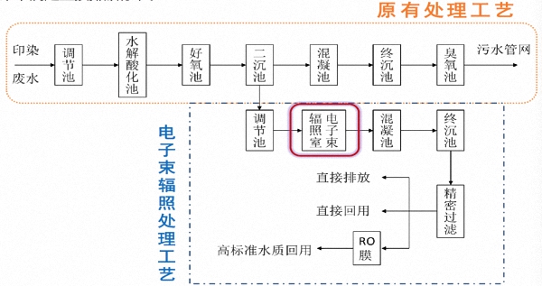 据张剑锋介绍,以浦江的示范工程为例,企业的原处理工艺是在生化处理后,出水采用混凝沉淀加臭氧氧化,只能达到接入城市污水处理厂的纳管标准。现在采用电子束辐照加混凝沉淀处理工艺,出水水质能够达到直接排放标准要求。如实现直接排放,与原工艺相比较,每吨废水处理费用可节省约1.4元。按每天处理10000吨计算,设备每年运行350天,一年可节约490万元左右。同时,印染废水经过电子束辐照深度处理后,能实现部分回用。