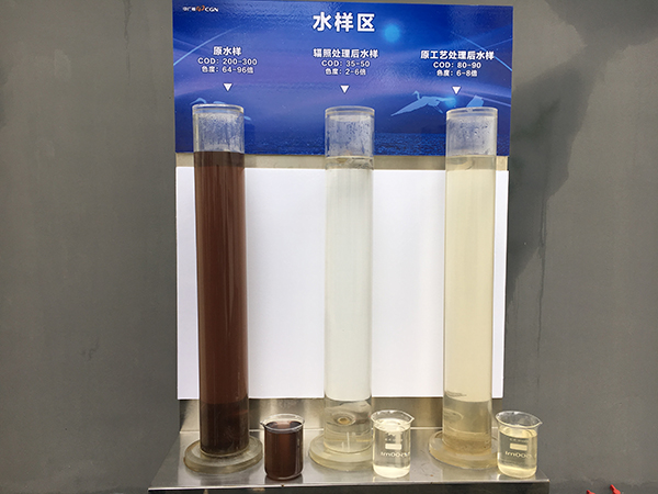 澎湃新闻(www.thepaper.cn)在示范项目现场看到,与用原工艺处理的水样相比,以电子束辐照深度处理后的工业废水脱色更明显,加速器厂房内采用了一台卧式电子加速器,单套设备占地约200平米。据现场工作人员介绍,废水在束下停留时间仅约0.01秒。
