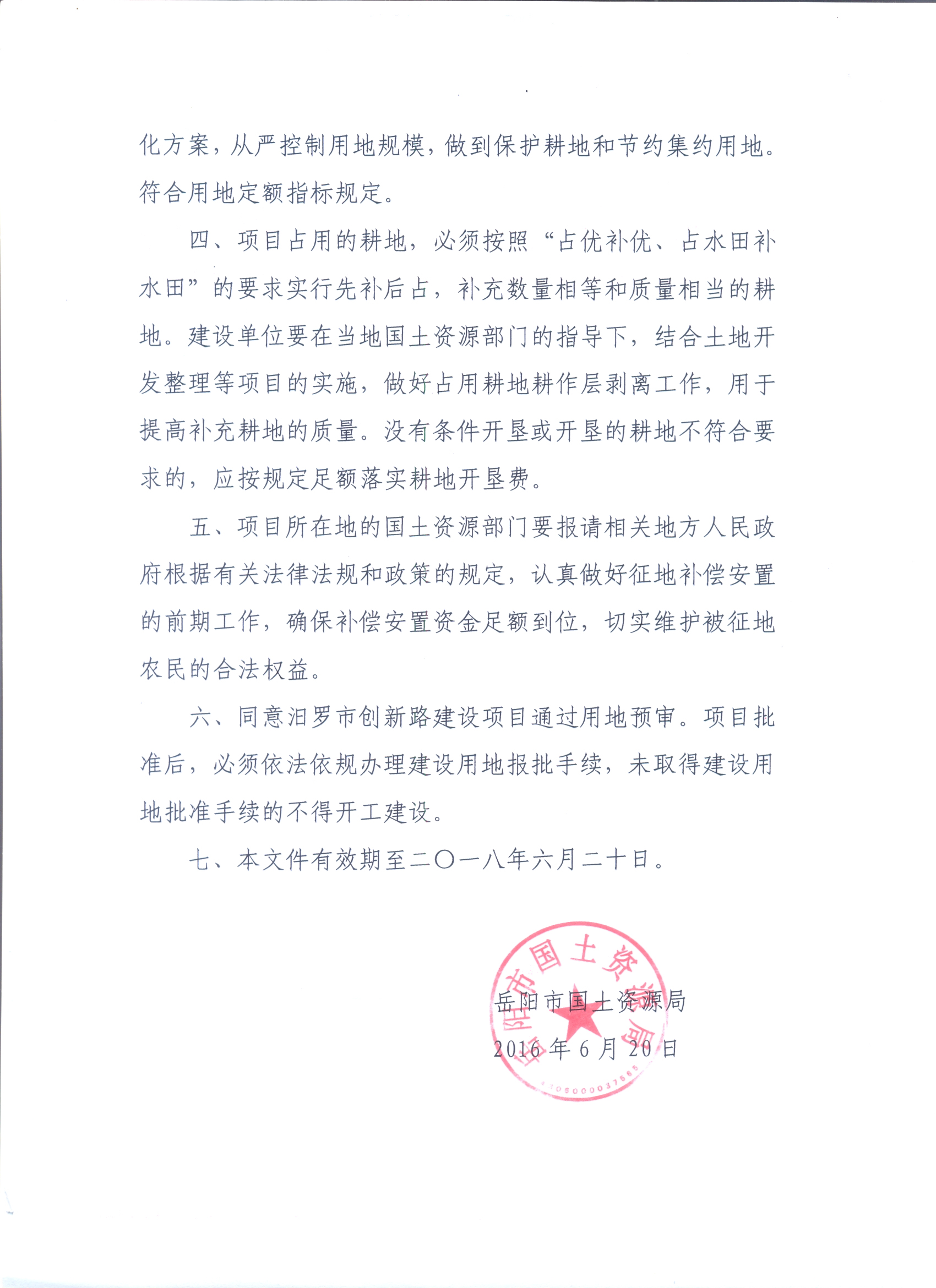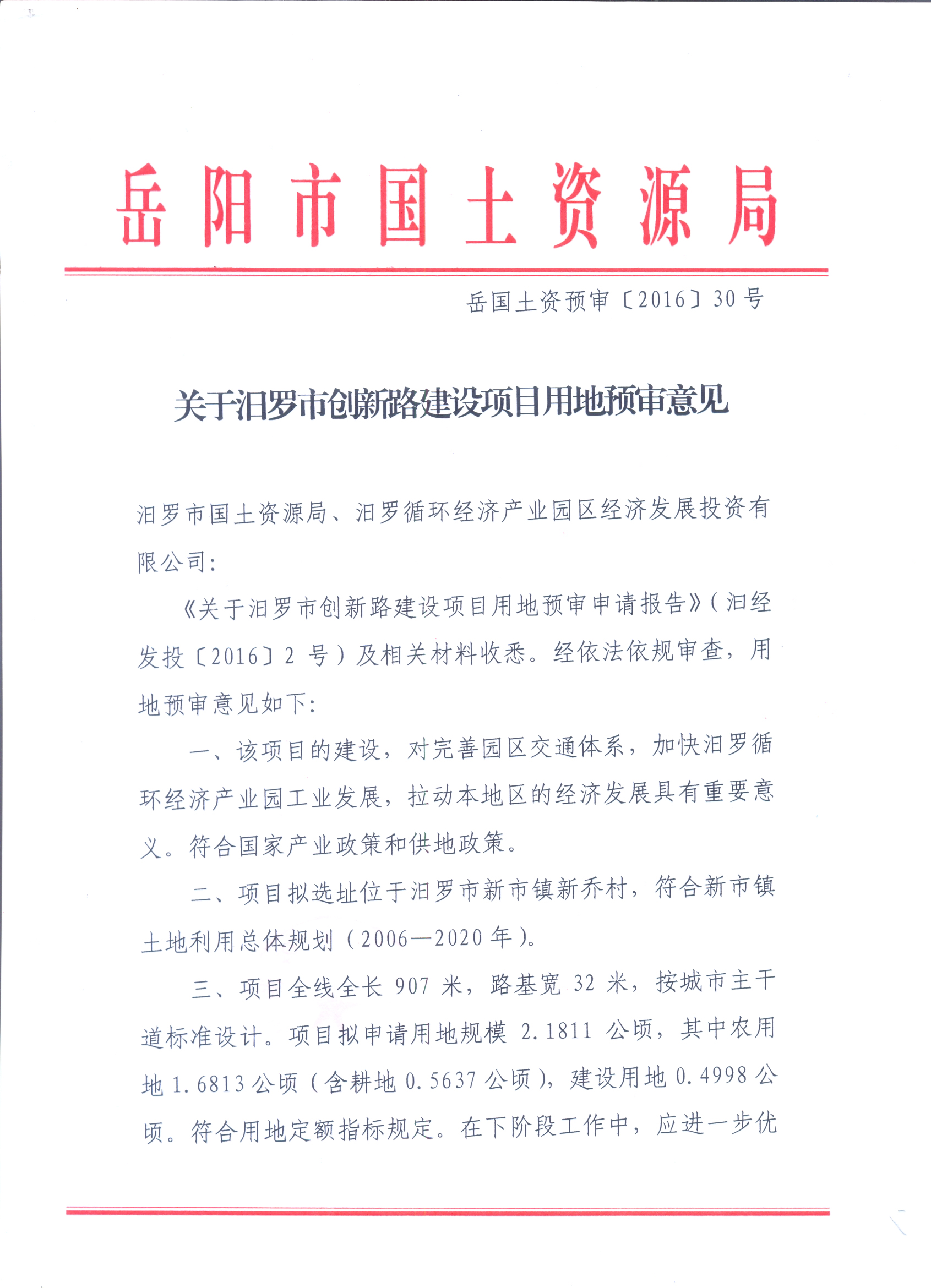 关于汨罗市创新路建设项目用地预审意见