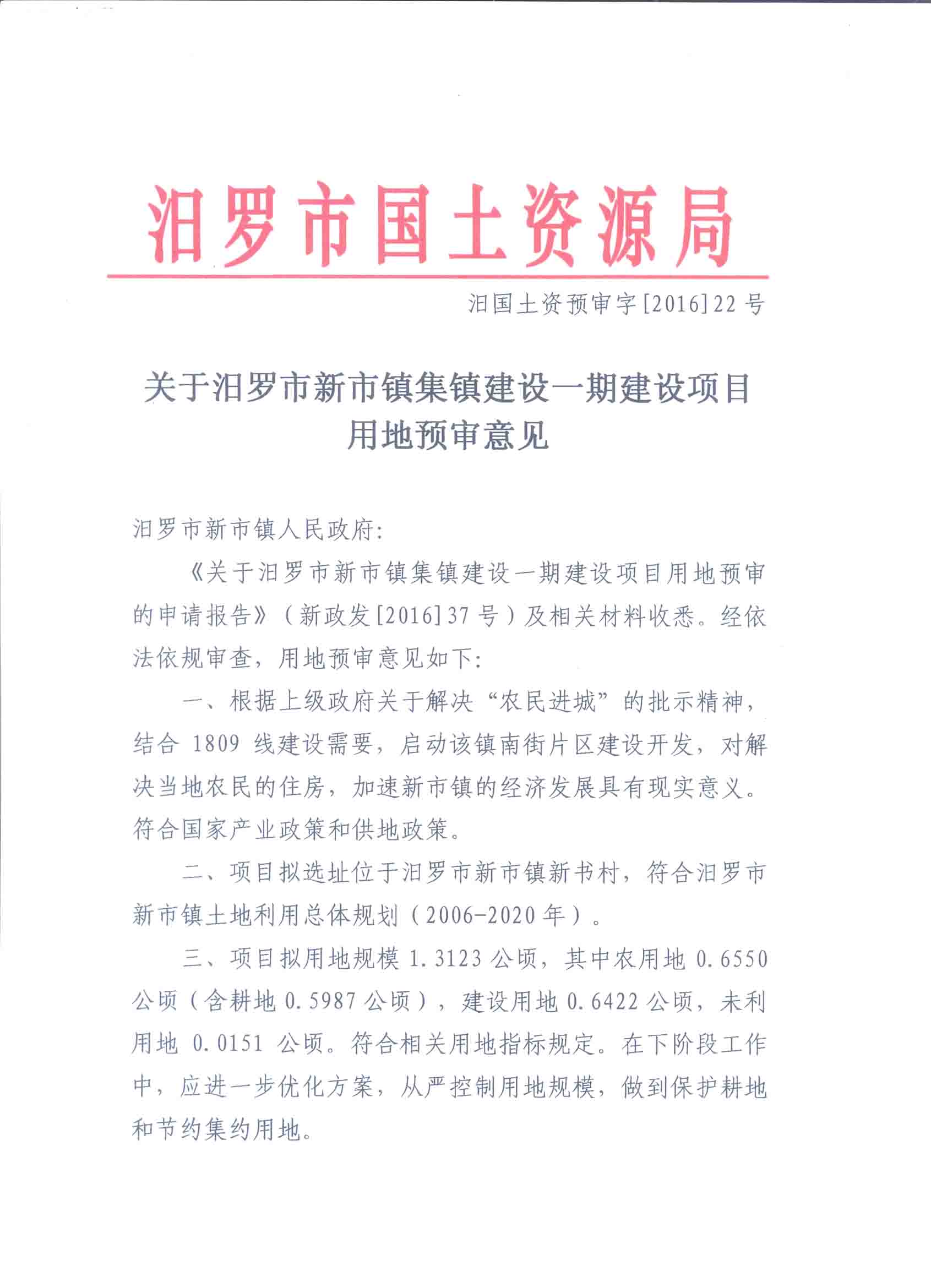 关于汨罗市新市镇集镇建设一期建设项目用地预审意见