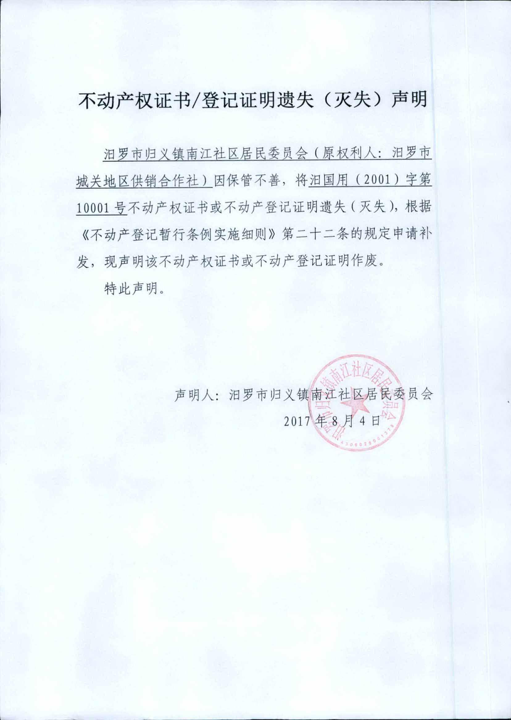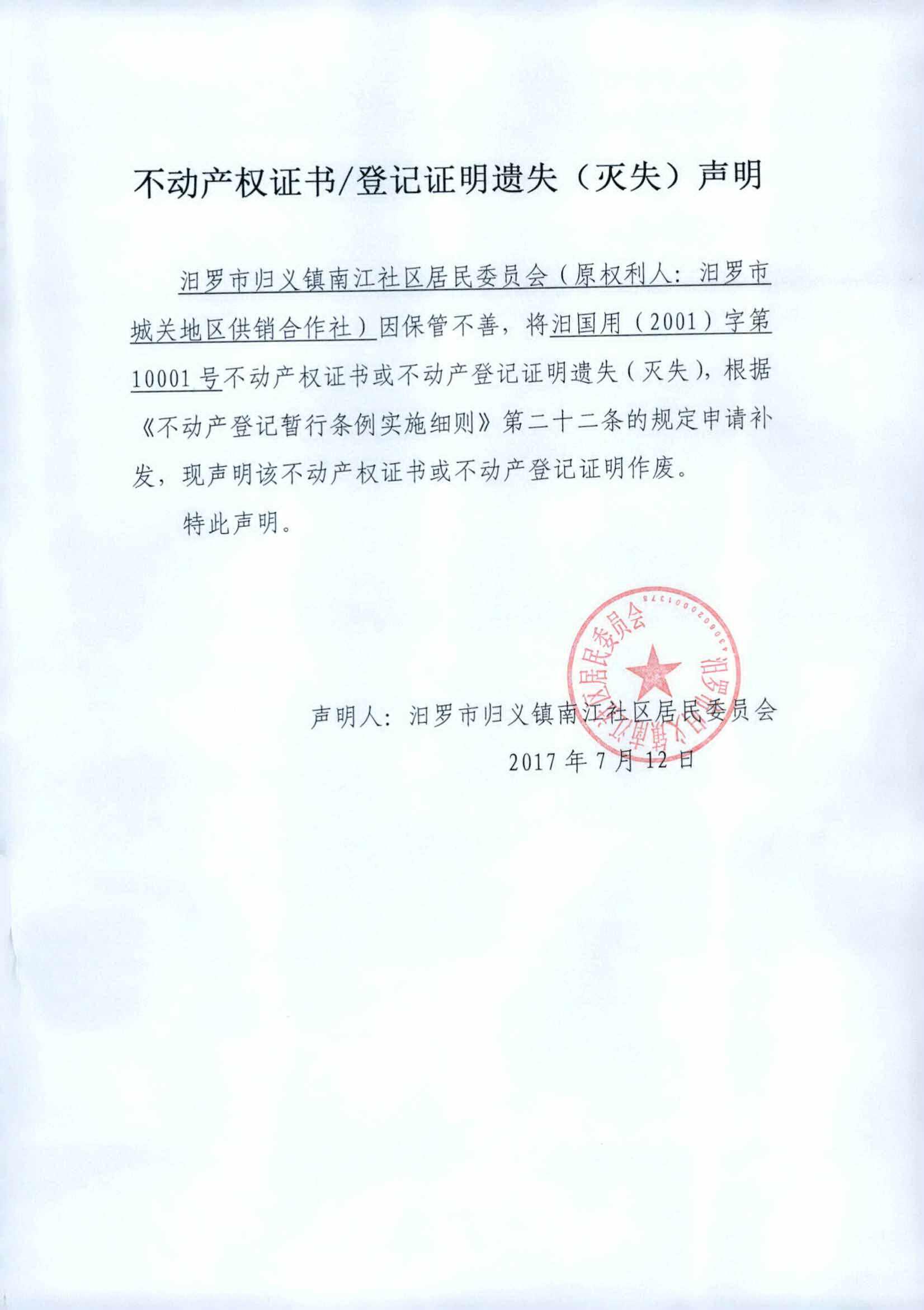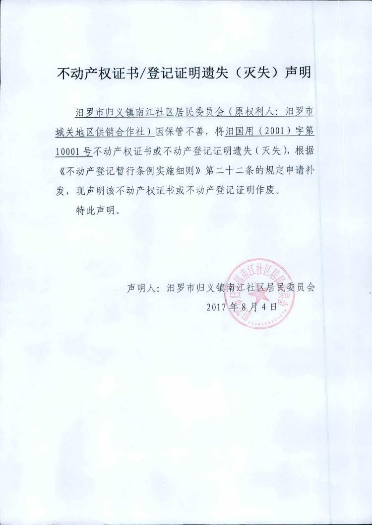 不动产权证书遗失声明(汨罗市归义镇南江社区居民委员会)