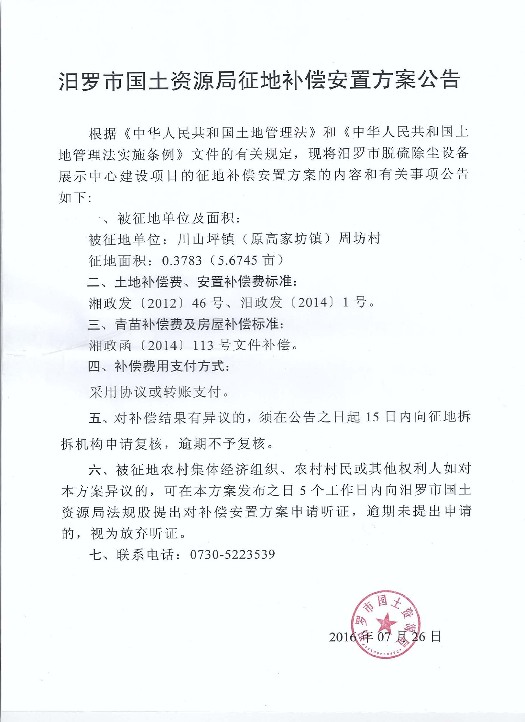 汨罗市国土资源局征地补偿安置方案公告(川山坪镇周坊村)
