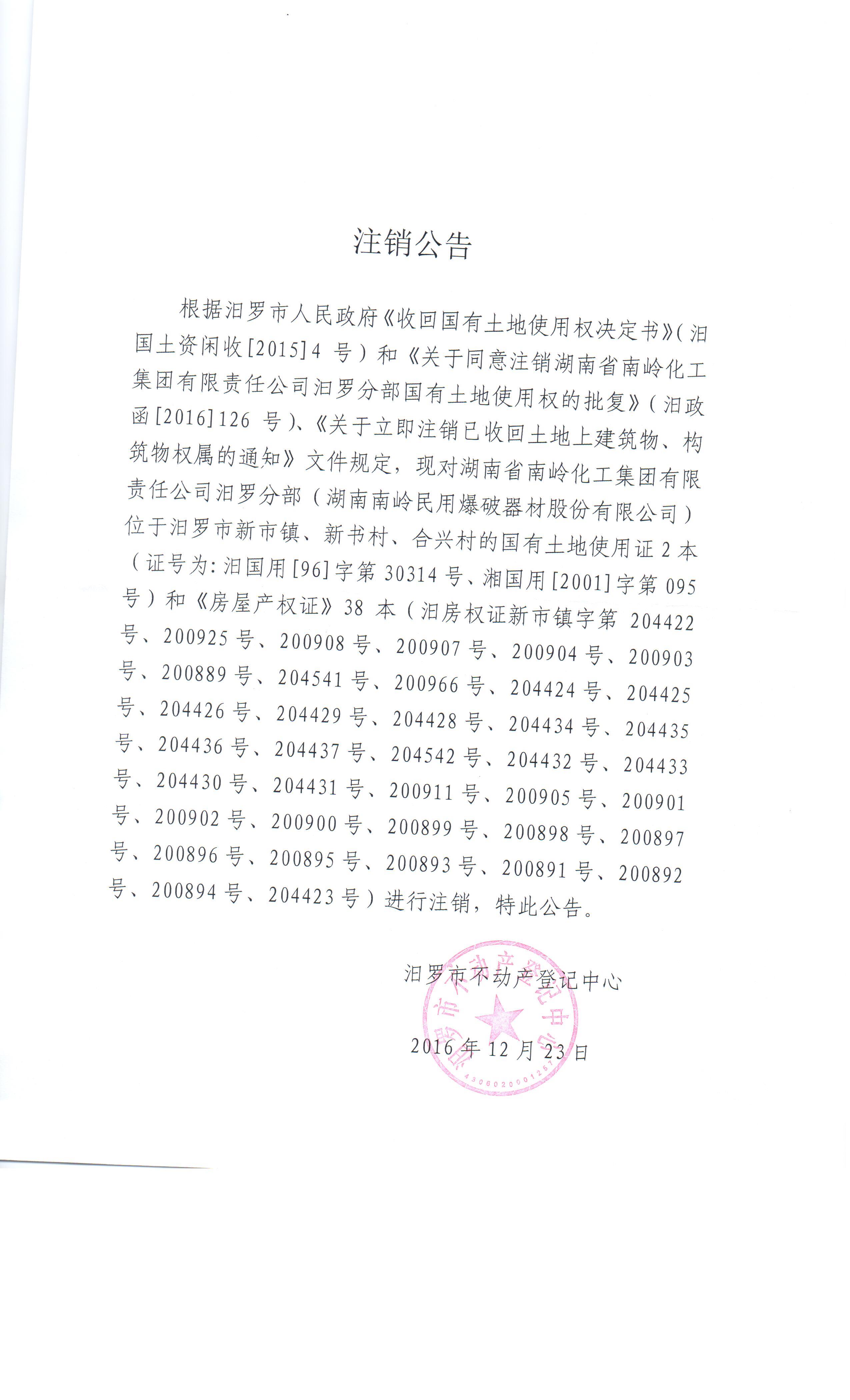 注销公告(湖南南岭民用爆破器材股份有限公司)