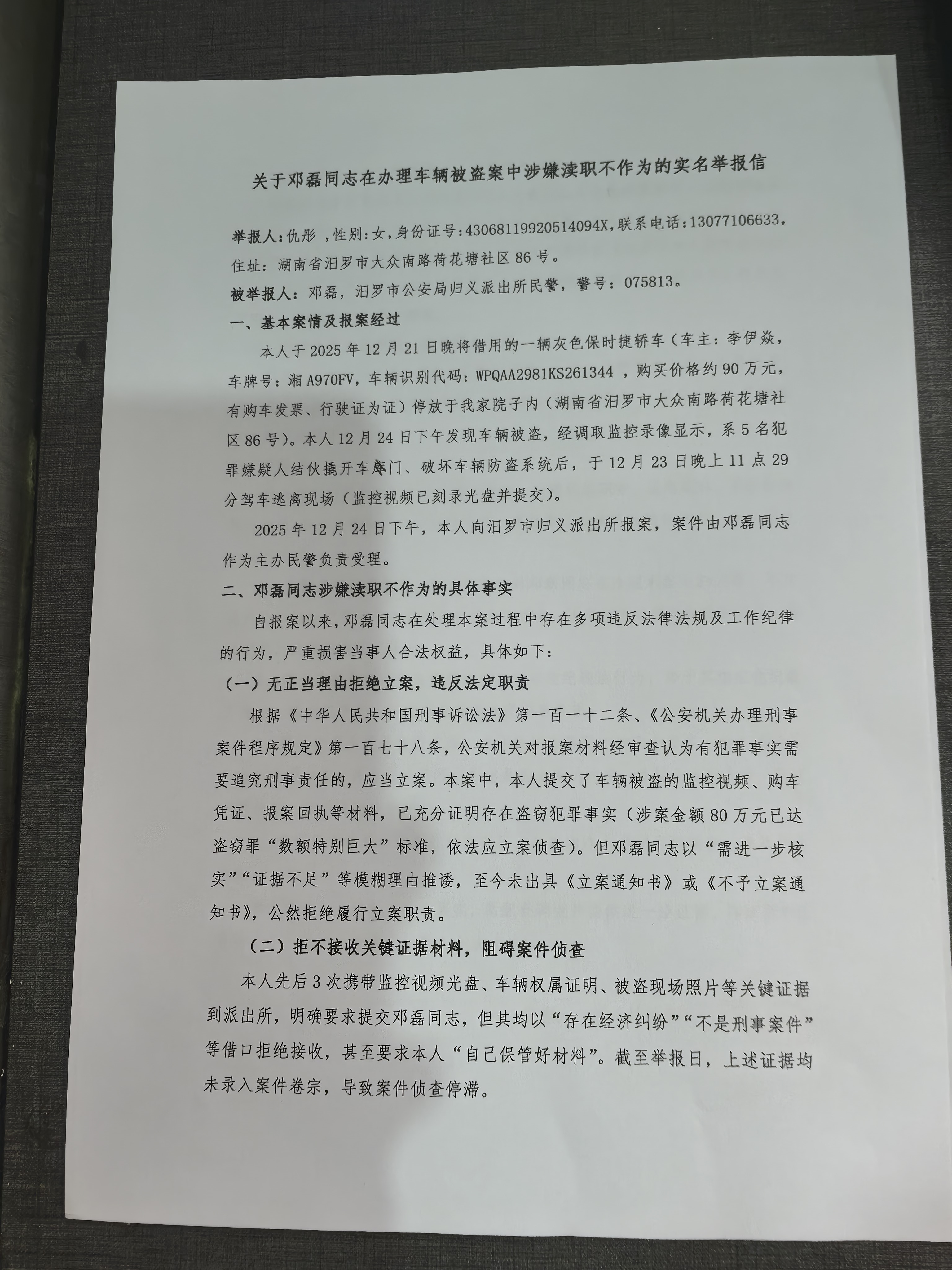 关于邓磊同志在办理车辆被盗案中涉嫌渎职不作为的实名举报信 举报人:仇彤 ,性别:女,身份证号:43068119920514094X,联系电话:13077106633,住址:湖南省汨罗市大众南路荷花塘社区86号。 被举报人:邓磊,汨罗市公安局归义派出所民警,警号:075813。 一、基本案情及报案经过 本人于2025年12月21日晚将借用的一辆灰色保时捷轿车(车主:李伊焱,车牌号:湘A970FV,车辆识别代码:WPQAA2981KS261344 ,购买价格约90万元,有购车发票、行驶证为证)停放于我家院子内(湖南省汨罗市大众南路荷花塘社区86号)。本人12月24日下午发现车辆被盗,经调取监控录像显示,系5名犯罪嫌疑人结伙撬开车门、破坏车辆防盗系统后,于12月23日晚上11点29分驾车逃离现场(监控视频已刻录光盘并提交)。 2025年12月24日下午,本人向汨罗市归义派出所报案,案件由邓磊同志作为主办民警负责受理。 二、邓磊同志涉嫌渎职不作为的具体事实 自报案以来,邓磊同志在处理本案过程中存在多项违反法律法规及工作纪律的行为,严重损害当事人合法权益,具体如下: (一)无正当理由拒绝立案,违反法定职责 根据《中华人民共和国刑事诉讼法》第一百一十二条、《公安机关办理刑事案件程序规定》第一百七十八条,公安机关对报案材料经审查认为有犯罪事实需要追究刑事责任的,应当立案。本案中,本人提交了车辆被盗的监控视频、购车凭证、报案回执等材料,已充分证明存在盗窃犯罪事实(涉案金额80万元已达盗窃罪“数额特别巨大”标准,依法应立案侦查)。但邓磊同志以“需进一步核实”“证据不足”等模糊理由推诿,至今未出具《立案通知书》或《不予立案通知书》,公然拒绝履行立案职责。 (二)拒不接收关键证据材料,阻碍案件侦查 本人先后3次携带监控视频光盘、车辆权属证明、被盗现场照片等关键证据到派出所,明确要求提交邓磊同志,但其均以“存在经济纠纷”“不是刑事案件”等借口拒绝接收,甚至要求本人“自己保管好材料”。截至举报日,上述证据均未录入案件卷宗,导致案件侦查停滞。 (三)私自接触犯罪嫌疑人,涉嫌通风报信或包庇 邓磊同志多次背着本人的情况下,多次通过私人电话联系其中一名犯罪嫌疑人刘国栋,通话内容涉及“案件进展”等敏感话题。本人曾要求邓磊当着本人面与犯罪嫌疑人电话,被邓磊明确拒绝,其行为严重违反《公安机关人民警察纪律条令》第十三条“严禁为违法犯罪行为人通风报信、说情开脱”的规定,存在滥用职权、徇私枉法的重大嫌疑。 (四)故意拖延办案期限,漠视群众利益 邓磊同志始终以“正在调查中”敷衍搪塞,从未主动联系本人告知案件进展,甚至在本人多次催促下仍态度恶劣,称“爱去哪告去哪告”,完全丧失人民警察应有的职业操守。 三、举报诉求 邓磊同志的行为已严重违反法律法规,涉嫌玩忽职守、滥用职权,不仅导致本人价值90万元的财产权益持续受损,更损害了公安机关的公信力。本人现提出以下诉求: 1、立即启动调查程序:恳请贵单位对邓磊同志在办理本案中的渎职、不作为及违规接触犯罪嫌疑人的行为进行全面调查,固定相关证据(如通话记录、接警记录、材料接收登记等); 2、依法追究责任:若查实邓磊同志存在违纪违法行为,给予其相应党纪政务处分;构成犯罪的,移送司法机关追究刑事责任; 3、更换办案人员并督促立案:立即撤销邓磊同志的主办资格,指定其他民警重新受理本案,并在法定期限内作出是否立案的决定;若符合立案条件,迅速开展侦查,全力追赃挽损; 4、书面反馈结果:调查处理完毕后,及时向本人书面告知调查结果及处理决定。 本人承诺以上举报内容均属实,愿配合调查并提供进一步证据。恳请贵单位秉持公正,维护法律尊严和群众合法权益! 附件1:微信图片_20251229162525_3_4.jpg 附件2:微信图片_20251229162523_2_4.jpg 附件3:微信图片_20251229163952_4_4.jpg 附件4:微信图片_20251229163953_5_4.jpg |