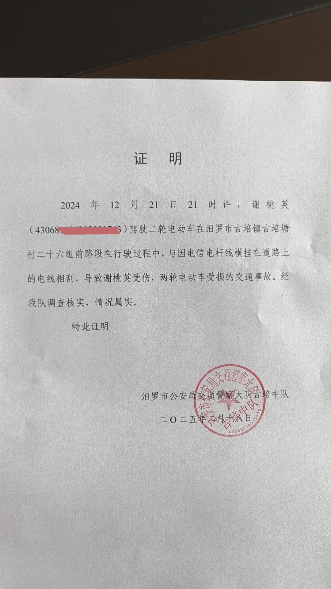 各位领导: 本人的母亲谢桃英于2024年底,因电信公司的网络线掉落于农村小路上,导致我母亲晚上骑小电驴被绊倒摔伤,医药费用全部需我们自行垫付,后于今晚2月底左右,由保险公司与电信公司负责人一起,与我们签订了保险理赔协议。但到今日止已经1月份了,赔偿金一直未到位,中间本人多次联系电信公司,电信公司说保险公司钱未到帐为由,一直拖付。希望我们汨罗的各位领导能为民作主,维护百姓的基本权益,垫付的费用到现在已经快一年了,说去办公室找他们,就是说没有人办公都要下乡,对于百姓来说,难道不要钱生活的吗?维权太难,望领导能帮忙重视,帮忙处理,不胜感激! |