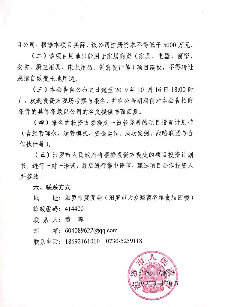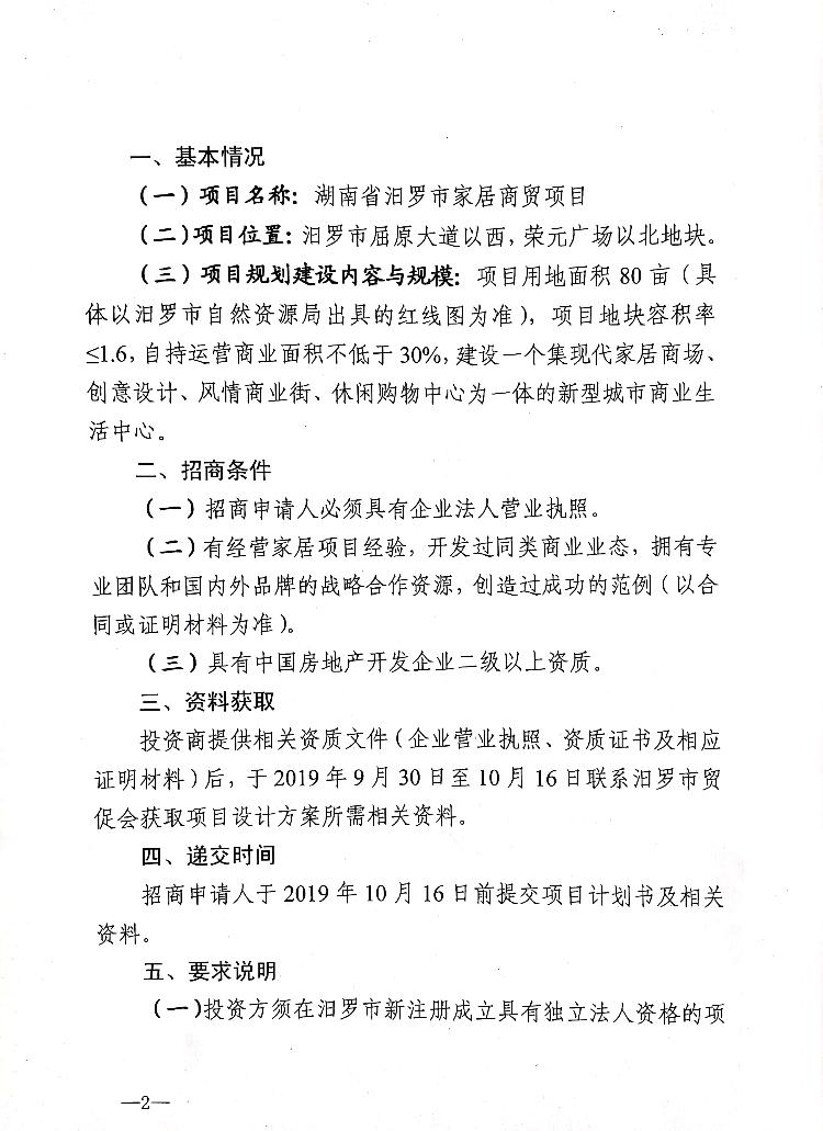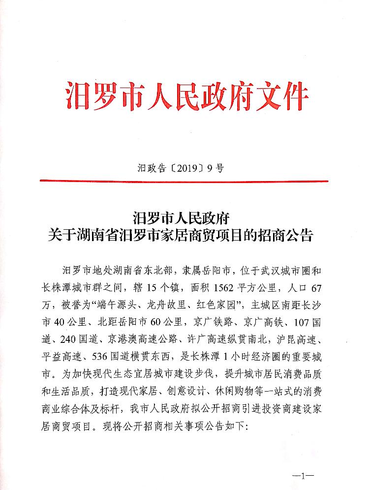 汨罗市人民政府 关于湖南省汨罗市家居商贸项目的招商公告
