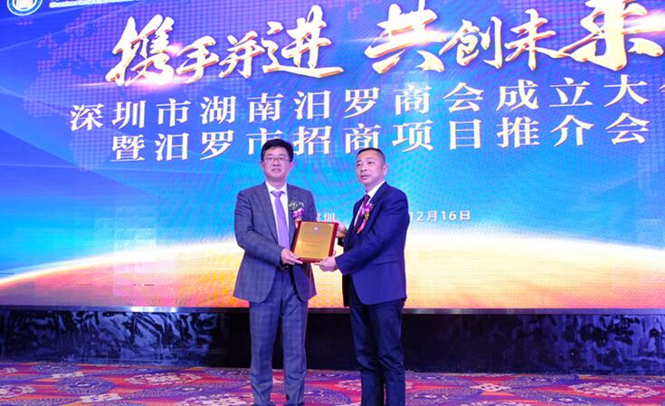市委副书记、市长朱平波(右)为深圳湖南汨罗商会首任会长周立军授牌