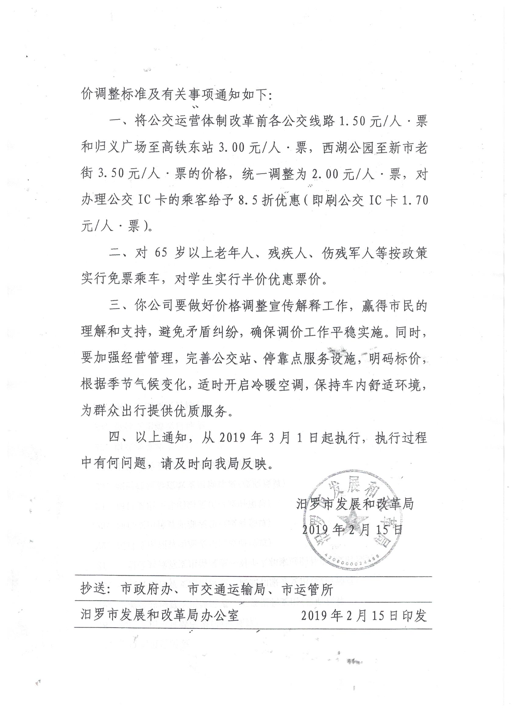 汨罗市发展和改革局关于调整汨罗市新能源公交车票价的通知
