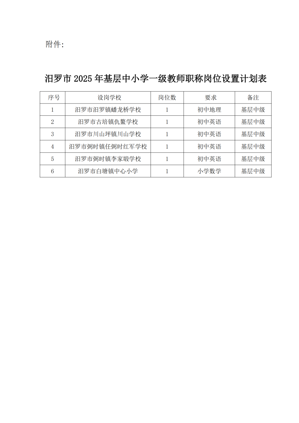 汨罗市2025年度基层中小学一级教师职称岗位设置情况公示