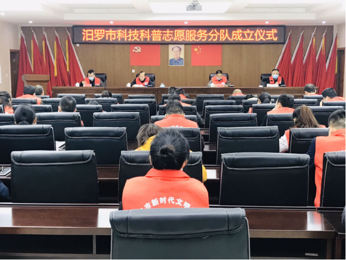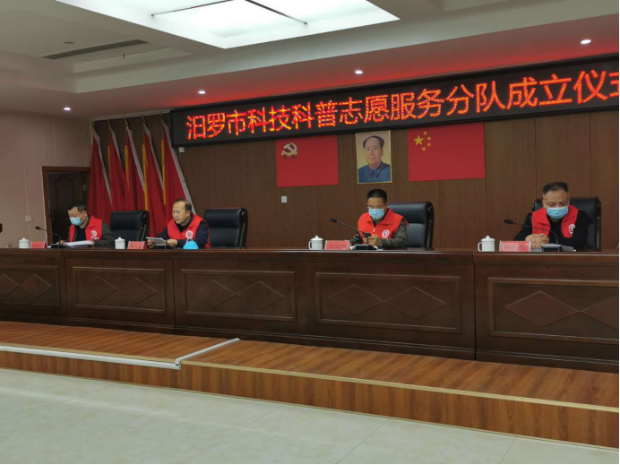 成立仪式由汨罗市科技科普志愿者分队队长、科技局党组书记李正海主持,志愿者分队副队长、人社局局长彭庆雄详细解读了科技科普志愿者分队志愿服务工作方案,志愿者分队副队长、市科协主席柳振宇代表志愿者作表态发言。