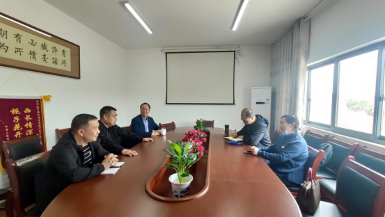 汨罗市科技局副局长彭旭汉(左一)、西长生态农业有限公司董事长彭双全(左二)与学院专家开展座谈