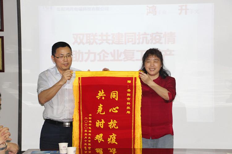 座谈中,鸿升电磁介绍了企业党建、疫情防控、科研生产情况和复工复产存在的困难。针对企业反映其电磁智能化科研技术需求问题,一支部党员、成果科科长何文军给予了工作建议。为致谢市科技局疫情期间派驻党员干部、农村科副科长易炼联点帮扶企业防疫和复工复产,公司负责人赠送“同心抗疫 共克时艰”锦旗。
