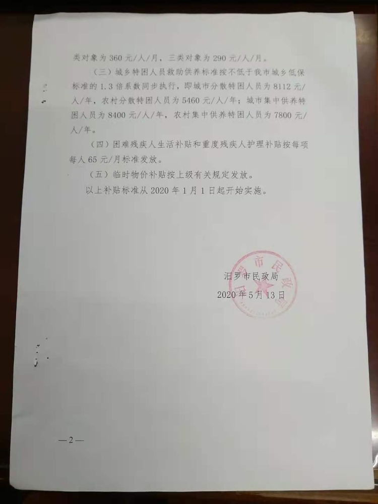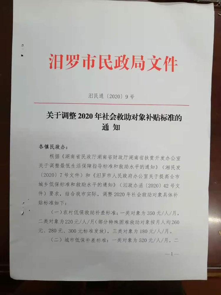 民政局关于调整2020年社会救助对象补贴标准的通知