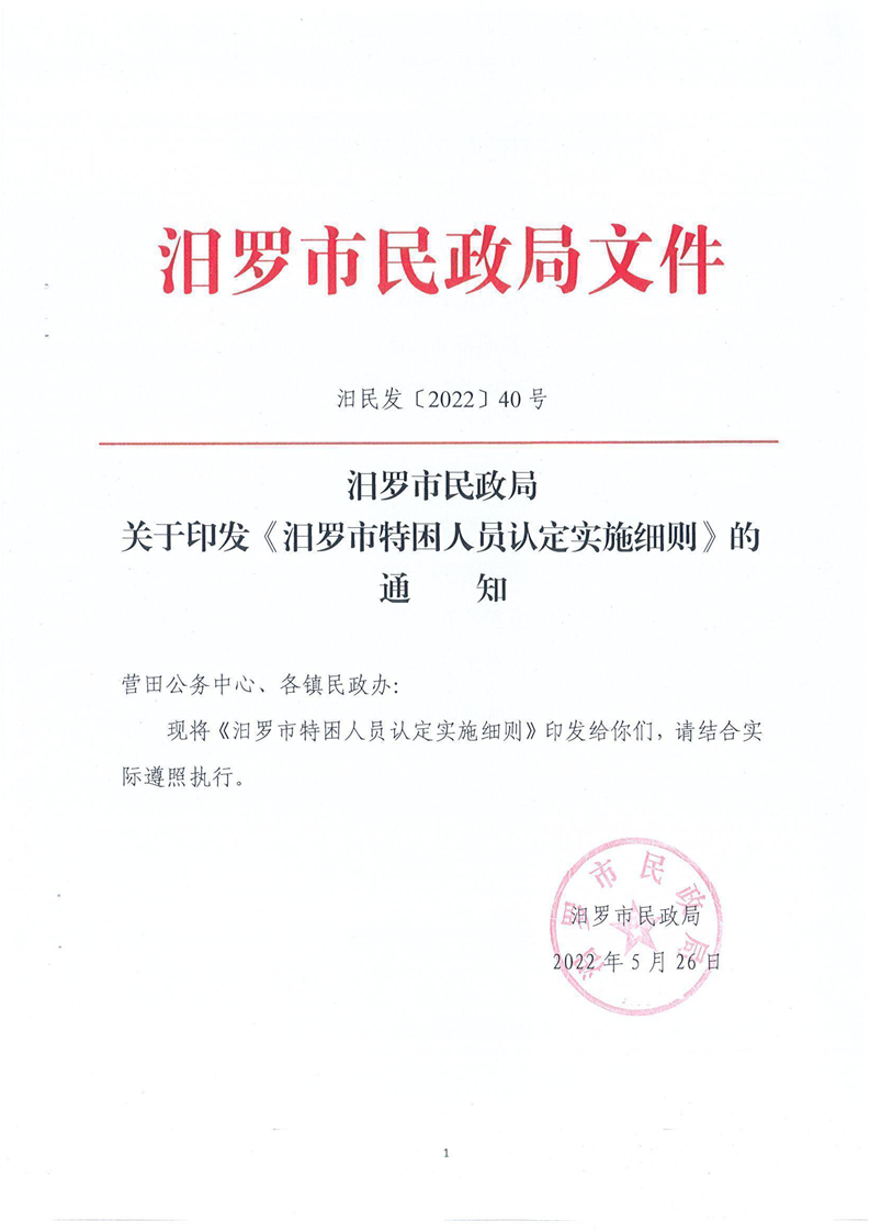 汨罗市民政局关于印发《汨罗市特困人员认定实施细则》的通知