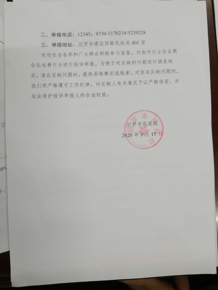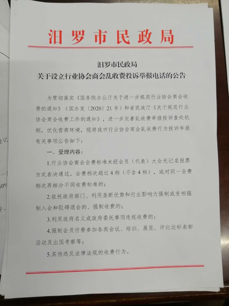 汨罗市民政局关于设立行业协会商会乱收费投诉举报电话的公告