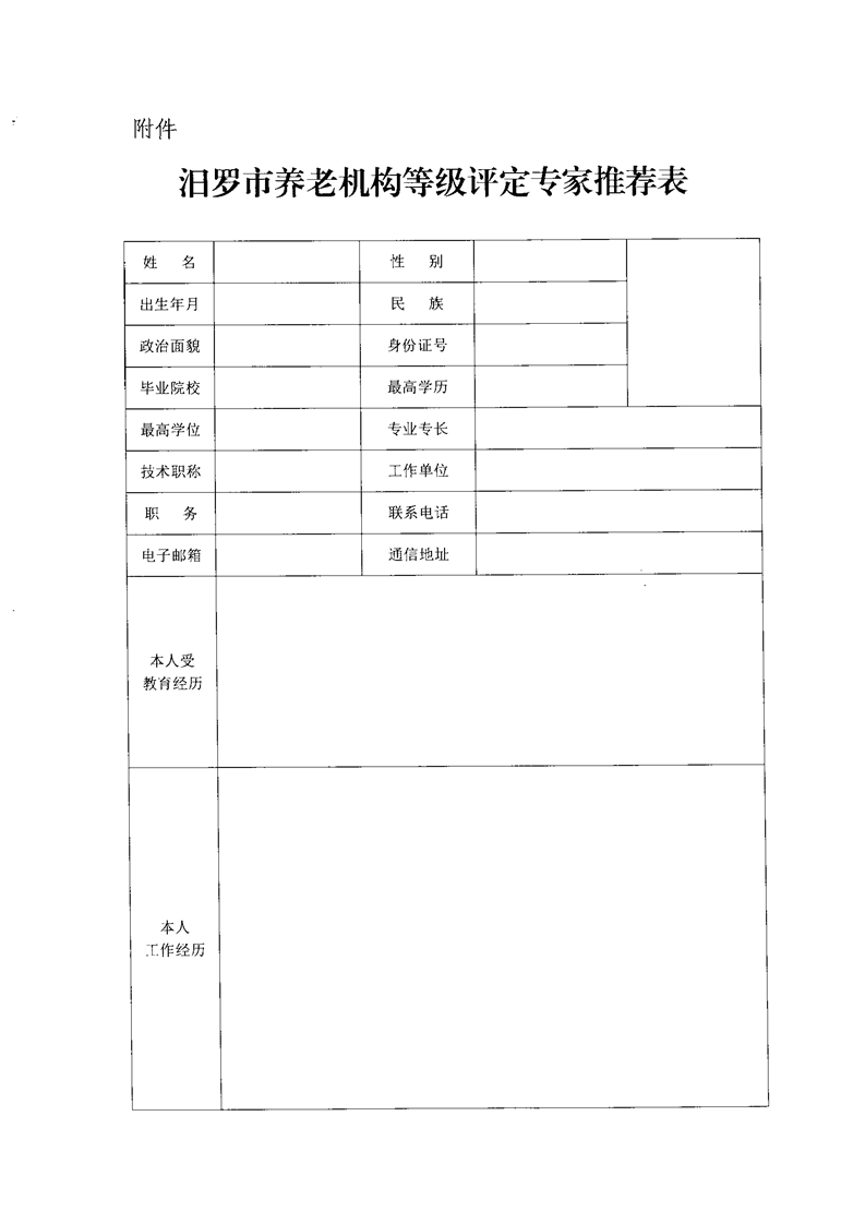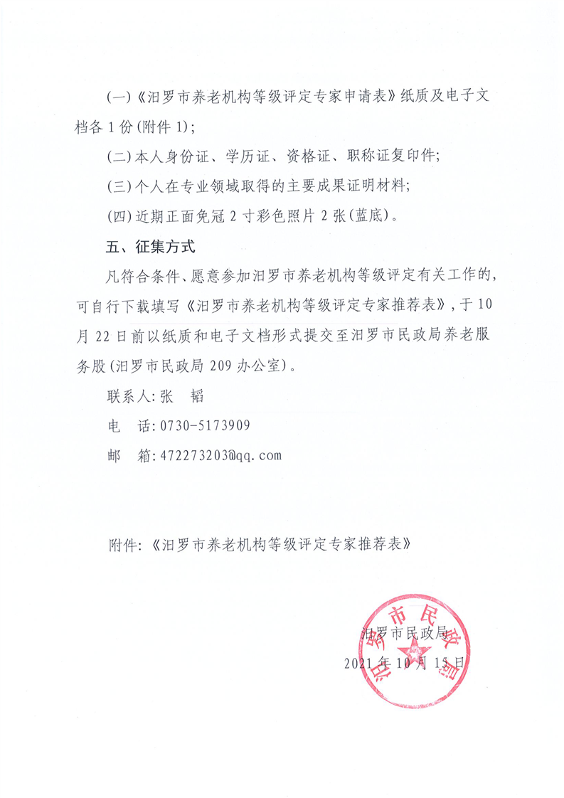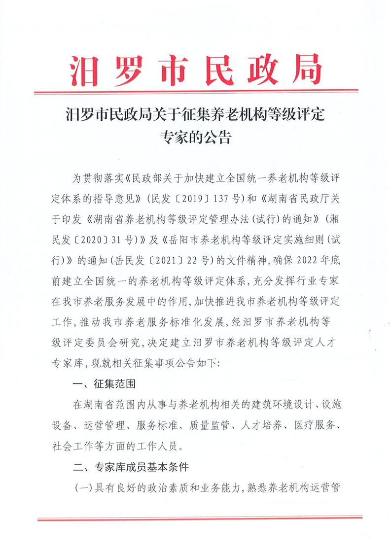 汨罗市民政局关于征集养老机构等级评定专家的公告