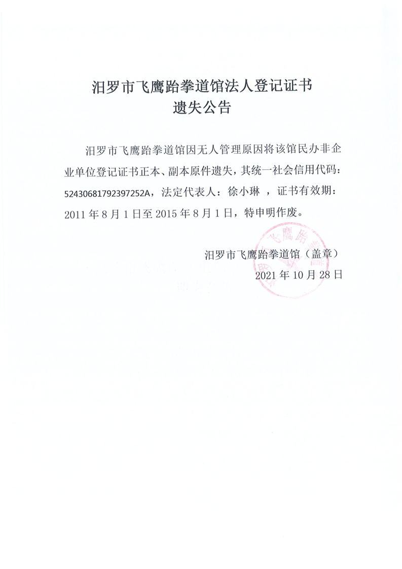 汨罗市飞鹰跆拳道馆法人登记证书遗失公告