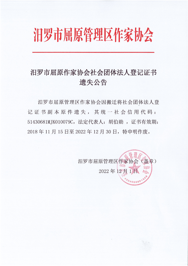屈原管理区作家协会社会团体法人登记证书遗失公告