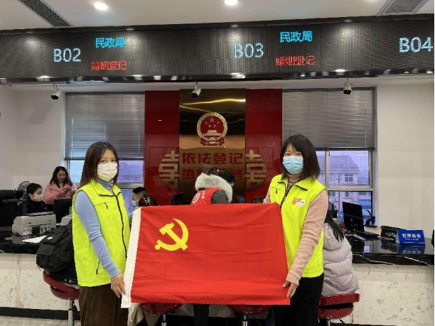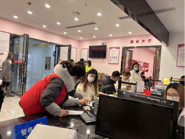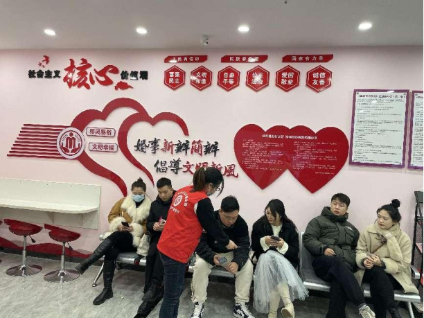在新人们等候的间隙,社工和志愿者为前来登记的新人及陪同的亲朋好友们派发《树立文明婚俗新风倡议书》,呼吁大家在订婚、结婚时,遵从文明节俭、简约时尚、绿色婚俗等移风易俗新理念,大力倡导红事新办,争做文明节俭婚俗新风尚的践行者、传播者。