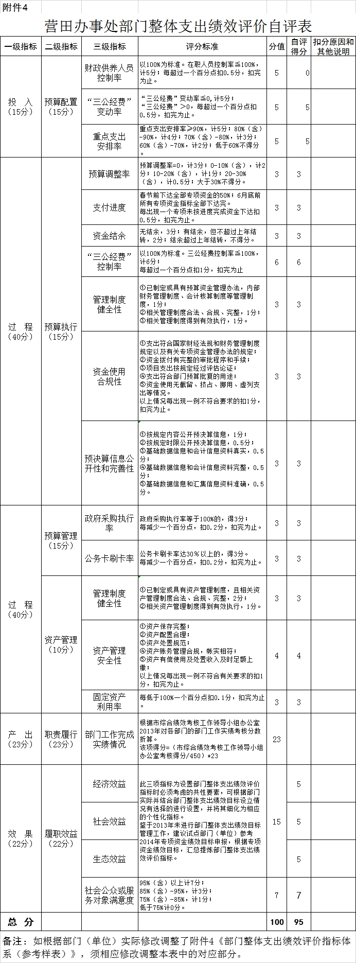 产出目标 (部门工作实绩,即绩效办制定的单位年度考核计分办法中考核的部门工作实绩内容) |