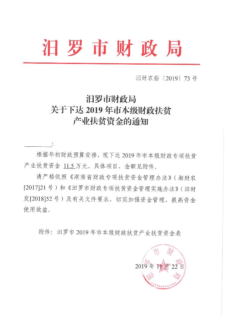 关于下达2019年市本级财政扶贫产业扶贫资金的通知