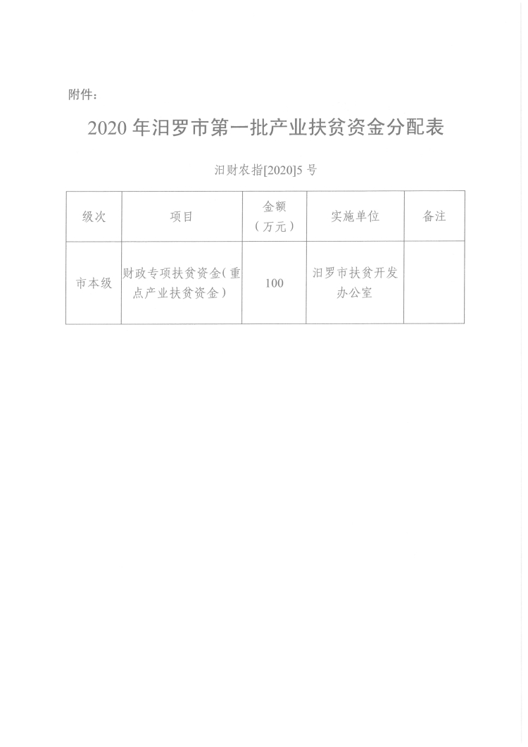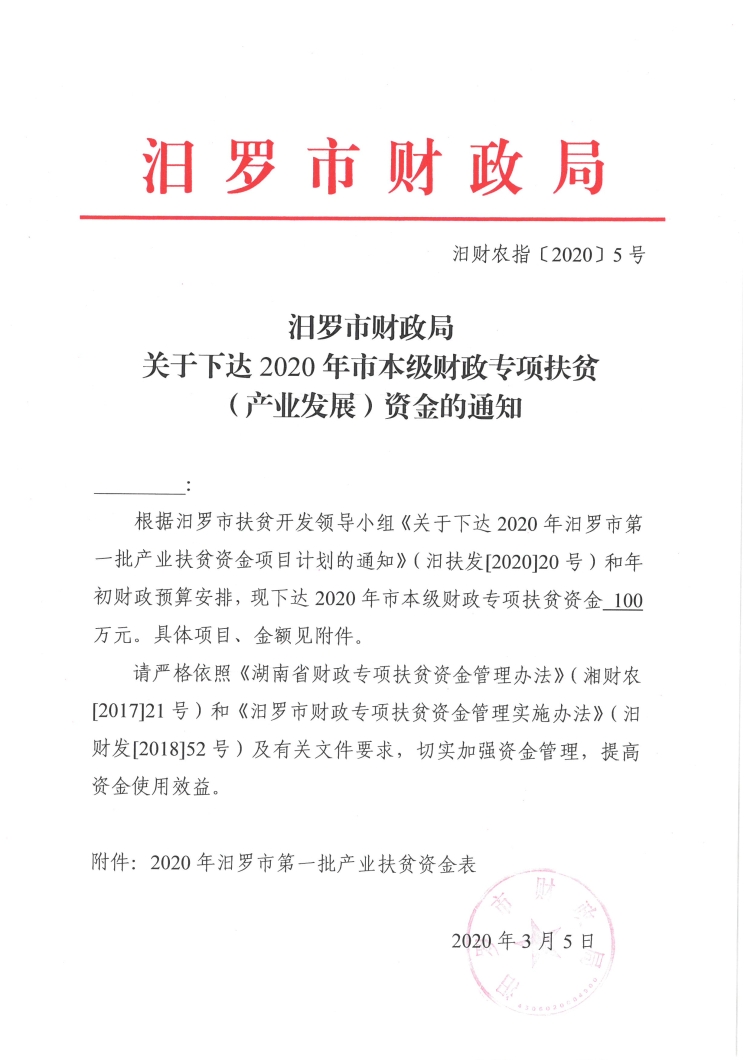 汨罗市财政局关于下达2020年市本级财政专项扶贫(产业发展)资金的通知
