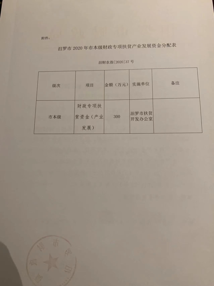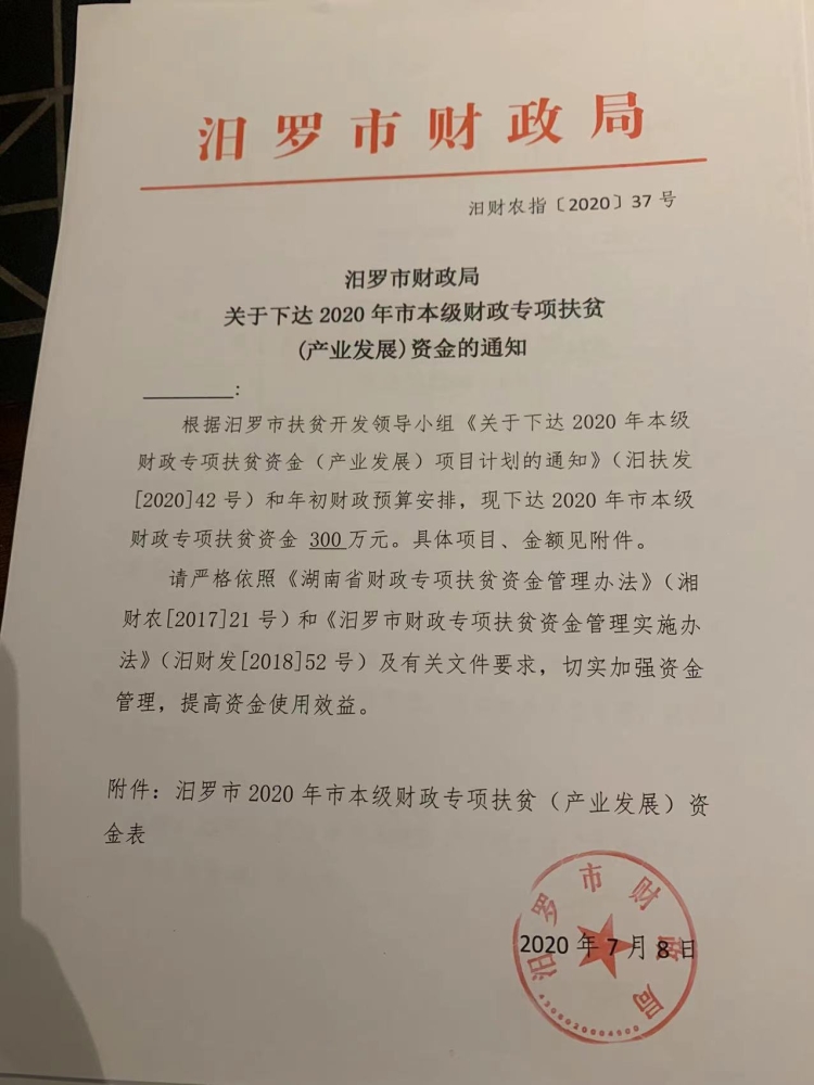 汨罗市财政局关于下达2020年市本级财政专项扶贫(产业发展)资金的通知