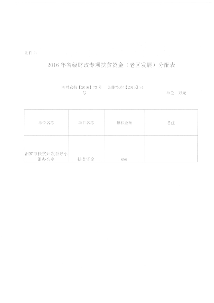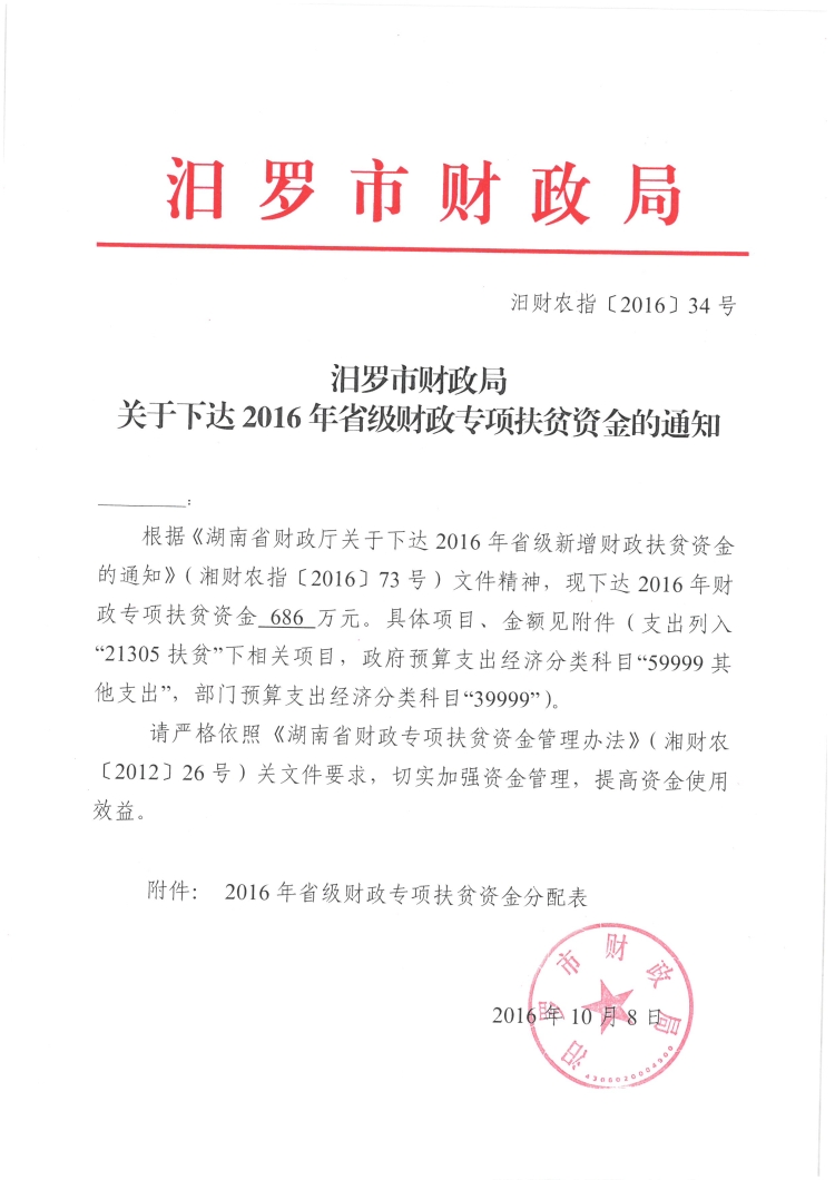 汨罗市财政局关于下达2016年省级财政专项扶贫资金的通知