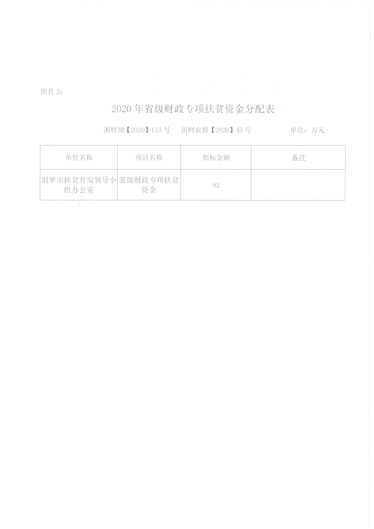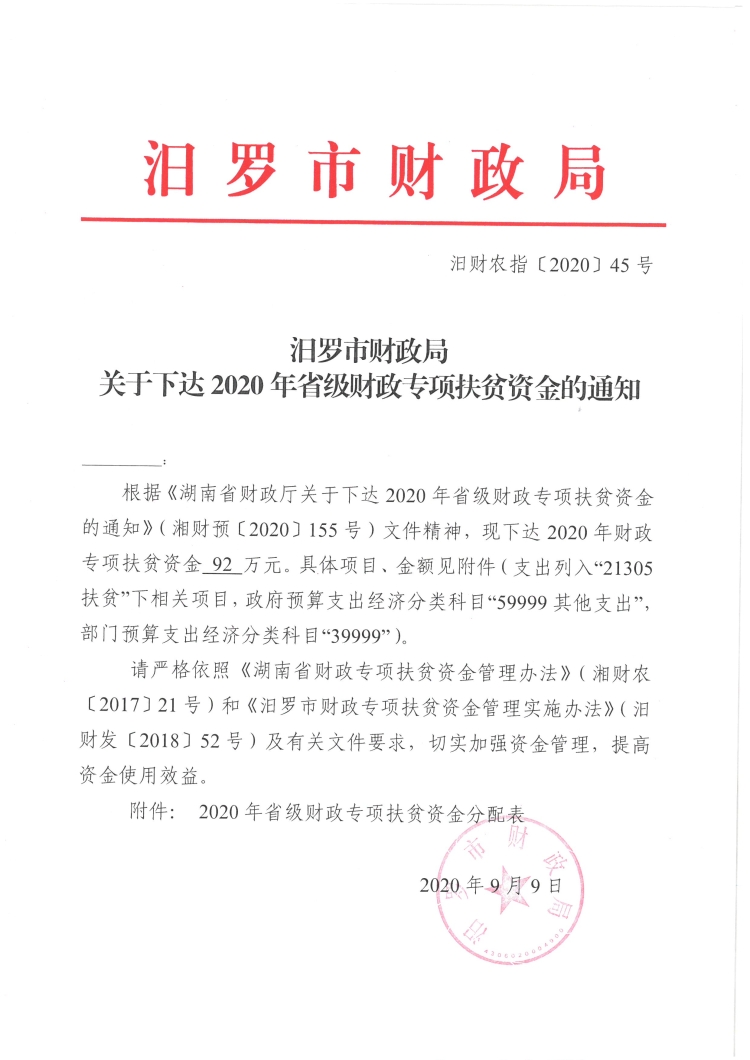 汨罗市财政局关于下达2020年省级财政专项扶贫资金的通知