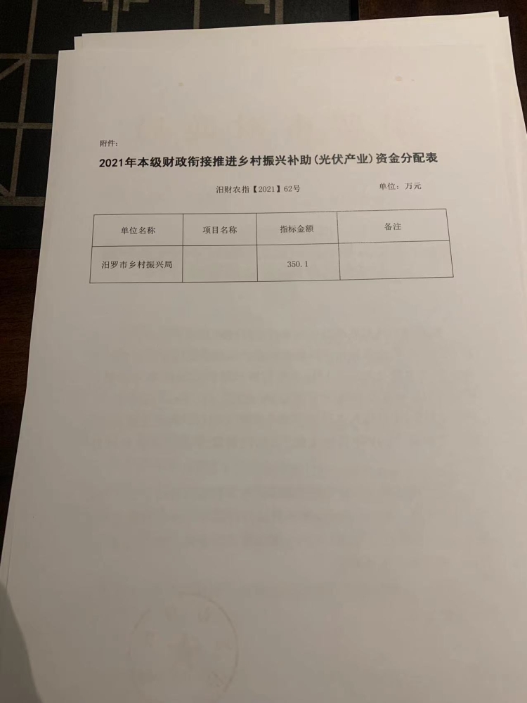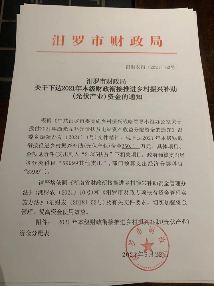 汨罗市财政局关于下达2021年本级财政衔接推进乡村振兴补助(光伏产业)资金的通知