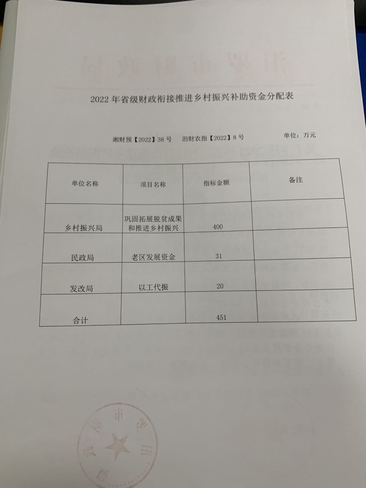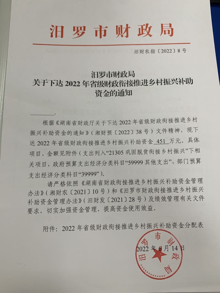 汨罗市财政局关于下达2022年省级财政衔接推进乡村振兴补助资金的通知
